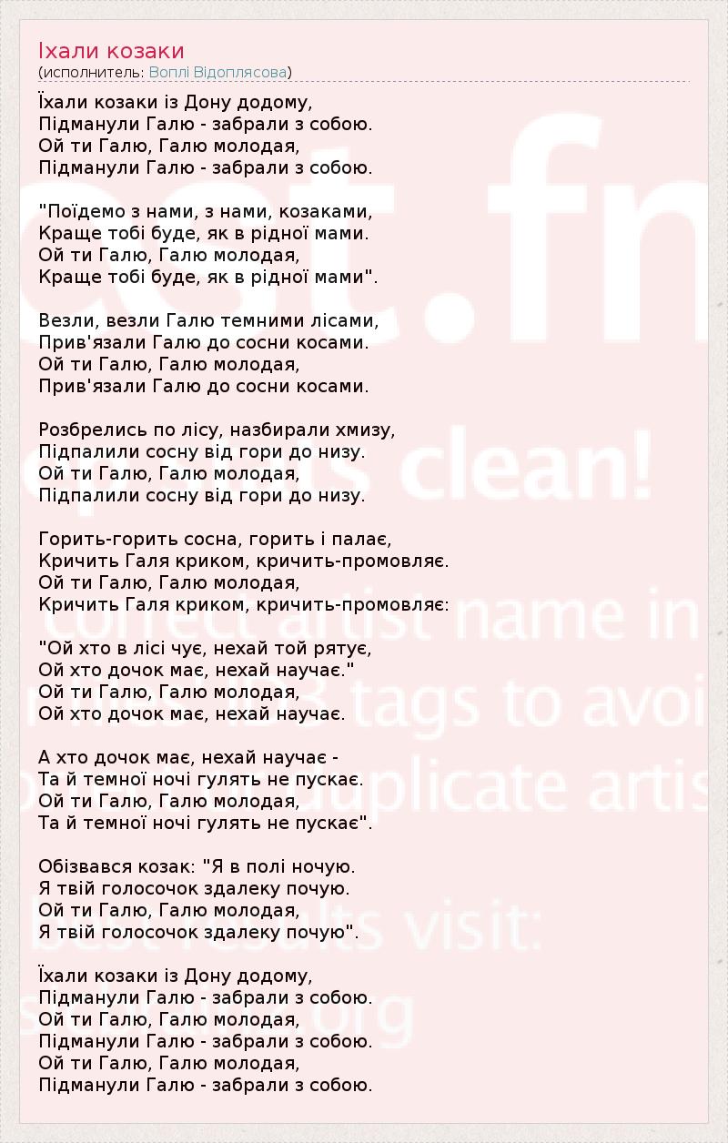 Їхали козаки із Дону додому, Підманули Галю - забрали з собою. Ой ти Галю, Галю молодая, Підманули Галю - забрали з собою. "Поїдемо з нами, з нами, козаками, Краще тобі буде, як в рідної мами. Ой ти Галю, Галю молодая, Краще тобі буде, як в рідної мами". Везли, везли Галю темними лісами, Прив'язали Галю до сосни косами. Ой ти Галю, Галю молодая, Прив'язали Галю до сосни косами. Розбрелись по лісу, назбирали хмизу, Підпалили сосну від гори до низу. Ой ти Галю, Галю молодая, Підпалили сосну від гори до низу. Горить-горить сосна, горить і палає, Кричить Галя криком, кричить-промовляє. Ой ти Галю, Галю молодая, Кричить Галя криком, кричить-промовляє: "Ой хто в лісі чує, нехай той рятує, Ой хто дочок має, нехай научає." Ой ти Галю, Галю молодая, Ой хто дочок має, нехай научає. А хто дочок має, нехай научає - Та й темної ночі гулять не пускає. Ой ти Галю, Галю молодая, Та й темної ночі гулять не пускає". Обізвався козак: "Я в полі ночую. Я твій голосочок здалеку почую. Ой ти Галю, Галю молодая, Я твій голосочок здалеку почую". Їхали козаки із Дону додому, Підманули Галю - забрали з собою. Ой ти Галю, Галю молодая, Підманули Галю - забрали з собою. Ой ти Галю, Галю молодая, Підманули Галю - забрали з собою.