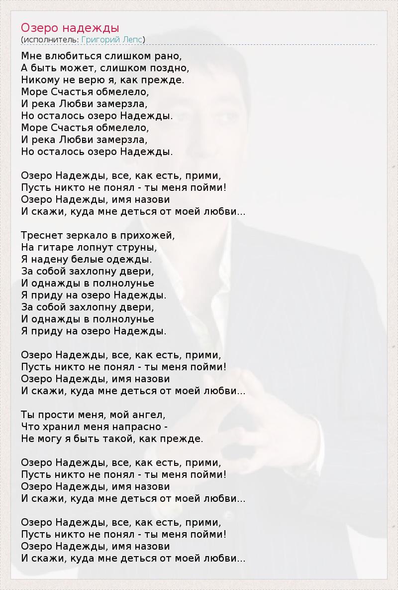 Мне влюбиться слишком рано, А быть может, слишком поздно, Никому не верю я, как прежде. Море Счастья обмелело, И река Любви замерзла, Но осталось озеро Надежды. Море Счастья обмелело, И река Любви замерзла, Но осталось озеро Надежды. Озеро Надежды, все, как есть, прими, Пусть никто не понял - ты меня пойми! Озеро Надежды, имя назови И скажи, куда мне деться от моей любви... Треснет зеркало в прихожей, На гитаре лопнут струны, Я надену белые одежды. За собой захлопну двери, И однажды в полнолунье Я приду на озеро Надежды. За собой захлопну двери, И однажды в полнолунье Я приду на озеро Надежды. Озеро Надежды, все, как есть, прими, Пусть никто не понял - ты меня пойми! Озеро Надежды, имя назови И скажи, куда мне деться от моей любви... Ты прости меня, мой ангел, Что хранил меня напрасно - Не могу я быть такой, как прежде. Озеро Надежды, все, как есть, прими, Пусть никто не понял - ты меня пойми! Озеро Надежды, имя назови И скажи, куда мне деться от моей любви... Озеро Надежды, все, как есть, прими, Пусть никто не понял - ты меня пойми! Озеро Надежды, имя назови И скажи, куда мне деться от моей любви...