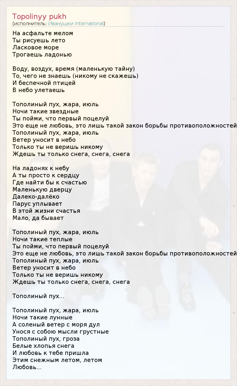 На асфальте мелом Ты рисуешь лето Ласковое море Трогаешь ладонью Воду, воздух, время (маленькую тайну) То, чего не знаешь (никому не скажешь) И беспечной птицей В небо улетаешь Тополиный пух, жара, июль Ночи такие звездные Ты пойми, что первый поцелуй Это еще не любовь, это лишь такой закон борьбы противоположностей Тополиный пух, жара, июль Ветер уносит в небо Только ты не веришь никому Ждешь ты только снега, снега, снега На ладонях к небу А ты просто к сердцу Где найти бы к счастью Маленькую дверцу Далеко-далёко Парус уплывает В этой жизни счастья Мало, да бывает Тополиный пух, жара, июль Ночи такие теплые Ты пойми, что первый поцелуй Это еще не любовь, это лишь такой закон борьбы противоположностей Тополиный пух, жара, июль Ветер уносит в небо Только ты не веришь никому Ждешь ты только снега, снега, снега Тополиный пух... Тополиный пух, жара, июль Ночи такие лунные А соленый ветер с моря дул Унося с собою мысли грустные Тополиный пух, гроза Белые хлопья снега И любовь к тебе пришла Этим снежным летом, летом Любовь...