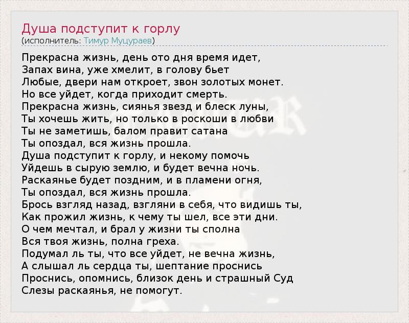 А как ты думаешь, о чем песня "Душа подступит к горлу" ?