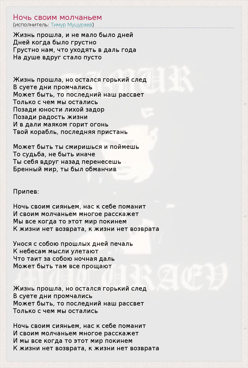 Жизнь прошла, и не мало было дней Дней когда было грустно Грустно нам, что уходять в даль года На душе вдруг стало пусто Жизнь прошла, но остался горький след В суете дни промчались Может быть, то последний наш рассвет Только с чем мы остались Позади юности лихой задор Позади радость жизни И в дали маяком горит огонь Твой корабль, последняя пристань Может быть ты смиришься и поймешь То судьба, не быть иначе Ты себя вдруг назад перенесешь Бренный мир, ты был обманчив Припев: Ночь своим сияньем, нас к себе поманит И своим молчаньем многое расскажет Мы все когда то этот мир покинем К жизни нет возврата, к жизни нет возврата Унося с собою прошлых дней печаль К небесам мысли улетают Что таит за собою ночная даль Может быть там все прощают Жизнь прошла, но остался горький след В суете дни промчались Может быть, то последний наш рассвет Только с чем мы остались Ночь своим сияньем, нас к себе поманит И своим молчаньем многое расскажет И мы все когда то этот мир покинем К жизни нет возврата, к жизни нет возврата