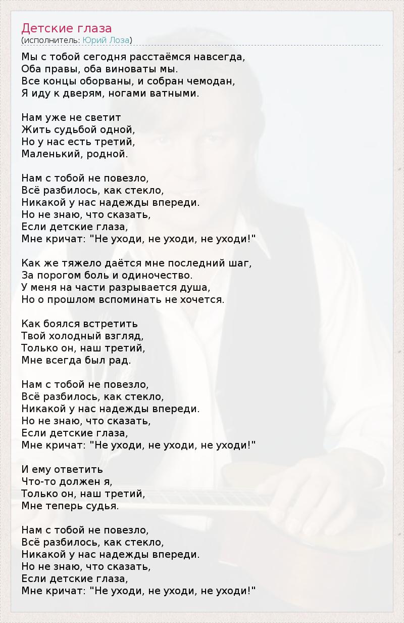 Мы с тобой сегодня расстаёмся навсегда, Оба правы, оба виноваты мы. Все концы оборваны, и собран чемодан, Я иду к дверям, ногами ватными. Нам уже не светит Жить судьбой одной, Но у нас есть третий, Маленький, родной. Нам с тобой не повезло, Всё разбилось, как стекло, Никакой у нас надежды впереди. Но не знаю, что сказать, Если детские глаза, Мне кричат: "Не уходи, не уходи, не уходи!" Как же тяжело даётся мне последний шаг, За порогом боль и одиночество. У меня на части разрывается душа, Но о прошлом вспоминать не хочется. Как боялся встретить Твой холодный взгляд, Только он, наш третий, Мне всегда был рад. Нам с тобой не повезло, Всё разбилось, как стекло, Никакой у нас надежды впереди. Но не знаю, что сказать, Если детские глаза, Мне кричат: "Не уходи, не уходи, не уходи!" И ему ответить Что-то должен я, Только он, наш третий, Мне теперь судья. Нам с тобой не повезло, Всё разбилось, как стекло, Никакой у нас надежды впереди. Но не знаю, что сказать, Если детские глаза, Мне кричат: "Не уходи, не уходи, не уходи!"