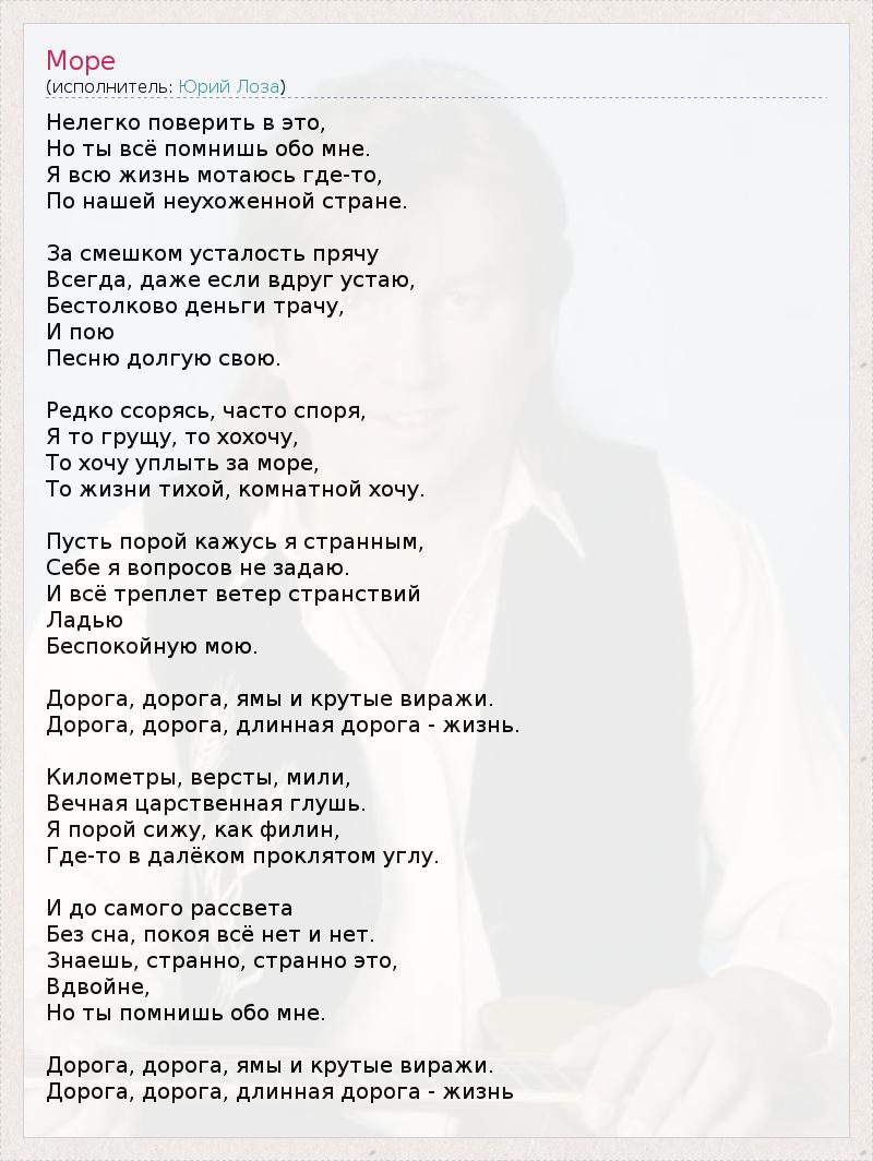 Нелегко поверить в это, Но ты всё помнишь обо мне. Я всю жизнь мотаюсь где-то, По нашей неухоженной стране. За смешком усталость прячу Всегда, даже если вдруг устаю, Бестолково деньги трачу, И пою Песню долгую свою. Редко ссорясь, часто споря, Я то грущу, то хохочу, То хочу уплыть за море, То жизни тихой, комнатной хочу. Пусть порой кажусь я странным, Себе я вопросов не задаю. И всё треплет ветер странствий Ладью Беспокойную мою. Дорога, дорога, ямы и крутые виражи. Дорога, дорога, длинная дорога - жизнь. Километры, версты, мили, Вечная царственная глушь. Я порой сижу, как филин, Где-то в далёком проклятом углу. И до самого рассвета Без сна, покоя всё нет и нет. Знаешь, странно, странно это, Вдвойне, Но ты помнишь обо мне. Дорога, дорога, ямы и крутые виражи. Дорога, дорога, длинная дорога - жизнь