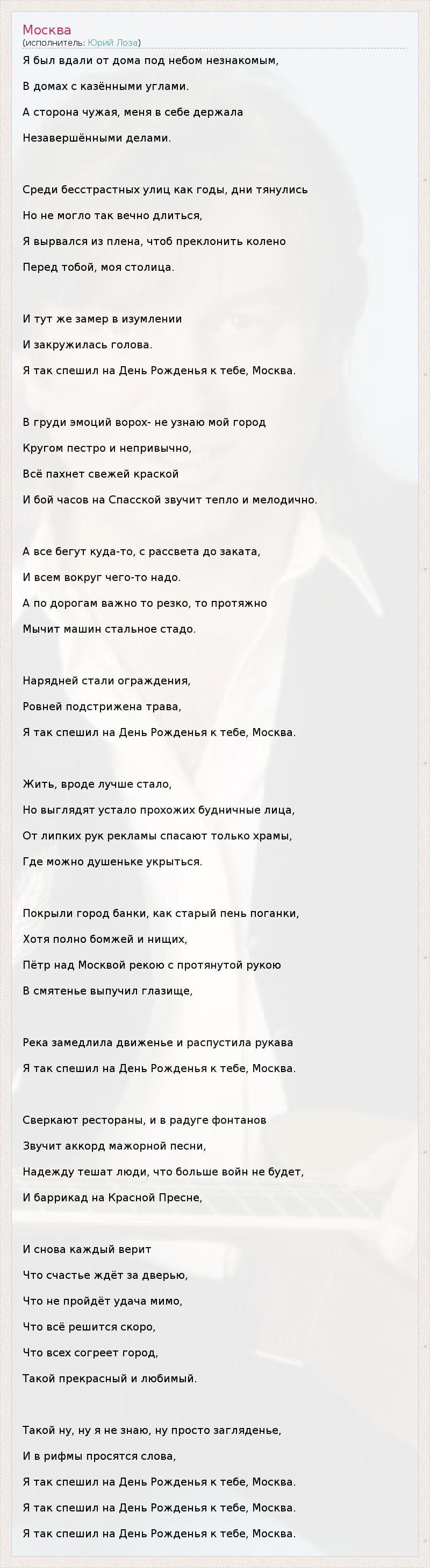 Я был вдали от дома под небом незнакомым, В домах с казёнными углами. А сторона чужая, меня в себе держала Незавершёнными делами. Среди бесстрастных улиц как годы, дни тянулись Но не могло так вечно длиться, Я вырвался из плена, чтоб преклонить колено Перед тобой, моя столица. И тут же замер в изумлении И закружилась голова. Я так спешил на День Рожденья к тебе, Москва. В груди эмоций ворох- не узнаю мой город Кругом пестро и непривычно, Всё пахнет свежей краской И бой часов на Спасской звучит тепло и мелодично. А все бегут куда-то, с рассвета до заката, И всем вокруг чего-то надо. А по дорогам важно то резко, то протяжно Мычит машин стальное стадо. Нарядней стали ограждения, Ровней подстрижена трава, Я так спешил на День Рожденья к тебе, Москва. Жить, вроде лучше стало, Но выглядят устало прохожих будничные лица, От липких рук рекламы спасают только храмы, Где можно душеньке укрыться. Покрыли город банки, как старый пень поганки, Хотя полно бомжей и нищих, Пётр над Москвой рекою с протянутой рукою В смятенье выпучил глазище, Река замедлила движенье и распустила рукава Я так спешил на День Рожденья к тебе, Москва. Сверкают рестораны, и в радуге фонтанов Звучит аккорд мажорной песни, Надежду тешат люди, что больше войн не будет, И баррикад на Красной Пресне, И снова каждый верит Что счастье ждёт за дверью, Что не пройдёт удача мимо, Что всё решится скоро, Что всех согреет город, Такой прекрасный и любимый. Такой ну, ну я не знаю, ну просто загляденье, И в рифмы просятся слова, Я так спешил на День Рожденья к тебе, Москва. Я так спешил на День Рожденья к тебе, Москва. Я так спешил на День Рожденья к тебе, Москва.