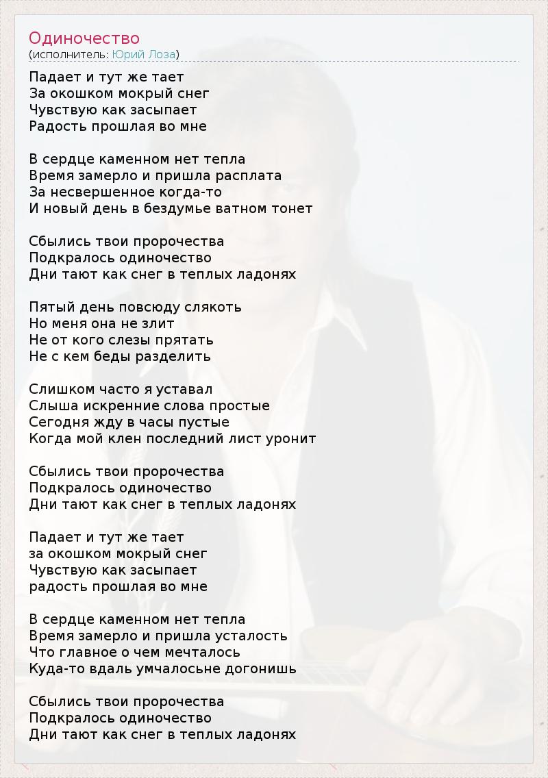 Падает и тут же тает За окошком мокрый снег Чувствую как засыпает Радость прошлая во мне В сердце каменном нет тепла Время замерло и пришла расплата За несвершенное когда-то И новый день в бездумье ватном тонет Сбылись твои пророчества Подкралось одиночество Дни тают как снег в теплых ладонях Пятый день повсюду слякоть Но меня она не злит Не от кого слезы прятать Не с кем беды разделить Слишком часто я уставал Слыша искренние слова простые Сегодня жду в часы пустые Когда мой клен последний лист уронит Сбылись твои пророчества Подкралось одиночество Дни тают как снег в теплых ладонях Падает и тут же тает за окошком мокрый снег Чувствую как засыпает радость прошлая во мне В сердце каменном нет тепла Время замерло и пришла усталость Что главное о чем мечталось Куда-то вдаль умчалосьне догонишь Сбылись твои пророчества Подкралось одиночество Дни тают как снег в теплых ладонях