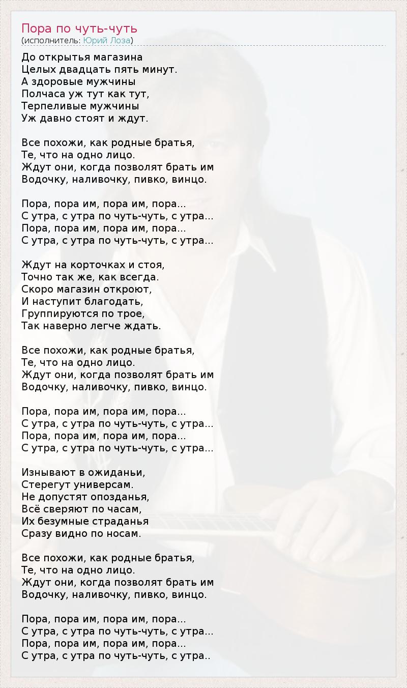 До открытья магазина Целых двадцать пять минут. А здоровые мужчины Полчаса уж тут как тут, Терпеливые мужчины Уж давно стоят и ждут. Все похожи, как родные братья, Те, что на одно лицо. Ждут они, когда позволят брать им Водочку, наливочку, пивко, винцо. Пора, пора им, пора им, пора... С утра, с утра по чуть-чуть, с утра... Пора, пора им, пора им, пора... С утра, с утра по чуть-чуть, с утра... Ждут на корточках и стоя, Точно так же, как всегда. Скоро магазин откроют, И наступит благодать, Группируются по трое, Так наверно легче ждать. Все похожи, как родные братья, Те, что на одно лицо. Ждут они, когда позволят брать им Водочку, наливочку, пивко, винцо. Пора, пора им, пора им, пора... С утра, с утра по чуть-чуть, с утра... Пора, пора им, пора им, пора... С утра, с утра по чуть-чуть, с утра... Изнывают в ожиданьи, Стерегут универсам. Не допустят опозданья, Всё сверяют по часам, Их безумные страданья Сразу видно по носам. Все похожи, как родные братья, Те, что на одно лицо. Ждут они, когда позволят брать им Водочку, наливочку, пивко, винцо. Пора, пора им, пора им, пора... С утра, с утра по чуть-чуть, с утра... Пора, пора им, пора им, пора... С утра, с утра по чуть-чуть, с утра..