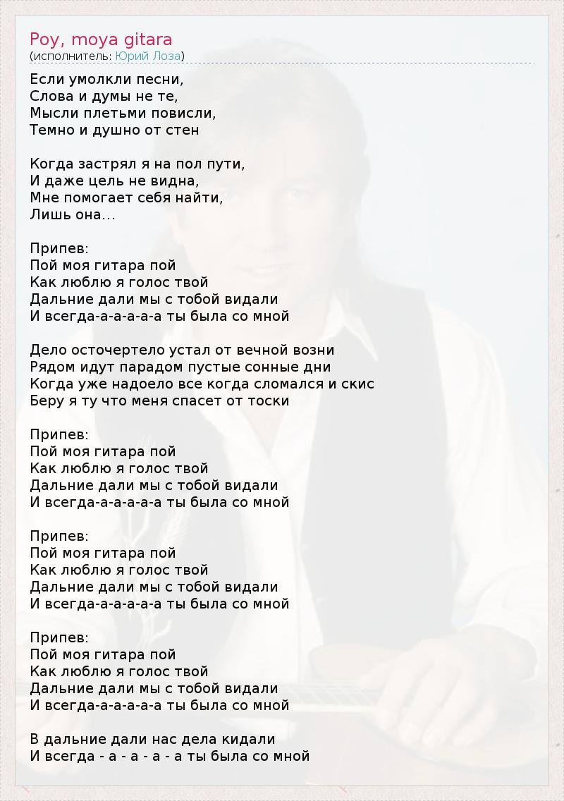 Если умолкли песни, Слова и думы не те, Мысли плетьми повисли, Темно и душно от стен Когда застрял я на пол пути, И даже цель не видна, Мне помогает себя найти, Лишь она… Припев: Пой моя гитара пой Как люблю я голос твой Дальние дали мы с тобой видали И всегда-а-а-а-а-а ты была со мной Дело осточертело устал от вечной возни Рядом идут парадом пустые сонные дни Когда уже надоело все когда сломался и скис Беру я ту что меня спасет от тоски Припев: Пой моя гитара пой Как люблю я голос твой Дальние дали мы с тобой видали И всегда-а-а-а-а-а ты была со мной Припев: Пой моя гитара пой Как люблю я голос твой Дальние дали мы с тобой видали И всегда-а-а-а-а-а ты была со мной Припев: Пой моя гитара пой Как люблю я голос твой Дальние дали мы с тобой видали И всегда-а-а-а-а-а ты была со мной В дальние дали нас дела кидали И всегда - а - а - а - а ты была со мной