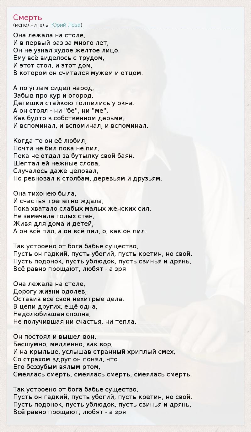 Она лежала на столе, И в первый раз за много лет, Он не узнал худое желтое лицо. Ему всё виделось с трудом, И этот стол, и этот дом, В котором он считался мужем и отцом. А по углам сидел народ, Забыв про кур и огород. Детишки стайкою толпились у окна. А он стоял - ни "бе", ни "ме", Как будто в собственном дерьме, И вспоминал, и вспоминал, и вспоминал. Когда-то он её любил, Почти не бил пока не пил, Пока не отдал за бутылку свой баян. Шептал ей нежные слова, Случалось даже целовал, Но ревновал к столбам, деревьям и друзьям. Она тихонею была, И счастья трепетно ждала, Пока хватало слабых малых женских сил. Не замечала голых стен, Живя для дома и детей, А он всё пил, а он всё пил, о, как он пил. Так устроено от бога бабье существо, Пусть он гадкий, пусть убогий, пусть кретин, но свой. Пусть подонок, пусть ублюдок, пусть свинья и дрянь, Всё равно прощают, любят - а зря Она лежала на столе, Дорогу жизни одолев, Оставив все свои нехитрые дела. В цепи других, ещё одна, Недолюбившая сполна, Не получившая ни счастья, ни тепла. Он постоял и вышел вон, Бесшумно, медленно, как вор, И на крыльце, услышав странный хриплый смех, Со страхом вдруг он понял, что Его беззубым вялым ртом, Смеялась смерть, смеялась смерть, смеялась смерть. Так устроено от бога бабье существо, Пусть он гадкий, пусть убогий, пусть кретин, но свой. Пусть подонок, пусть ублюдок, пусть свинья и дрянь, Всё равно прощают, любят - а зря