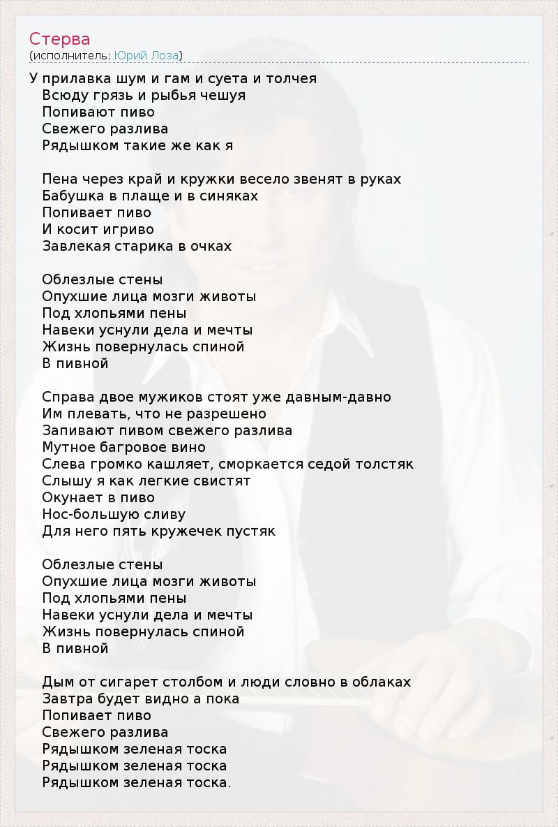 У прилавка шум и гам и суета и толчея Всюду грязь и рыбья чешуя Попивают пиво Свежего разлива Рядышком такие же как я Пена через край и кружки весело звенят в руках Бабушка в плаще и в синяках Попивает пиво И косит игриво Завлекая старика в очках Облезлые стены Опухшие лица мозги животы Под хлопьями пены Навеки уснули дела и мечты Жизнь повернулась спиной В пивной Справа двое мужиков стоят уже давным-давно Им плевать, что не разрешено Запивают пивом свежего разлива Мутное багровое вино Слева громко кашляет, сморкается седой толстяк Слышу я как легкие свистят Окунает в пиво Нос-большую сливу Для него пять кружечек пустяк Облезлые стены Опухшие лица мозги животы Под хлопьями пены Навеки уснули дела и мечты Жизнь повернулась спиной В пивной Дым от сигарет столбом и люди словно в облаках Завтра будет видно а пока Попивает пиво Свежего разлива Рядышком зеленая тоска Рядышком зеленая тоска Рядышком зеленая тоска.