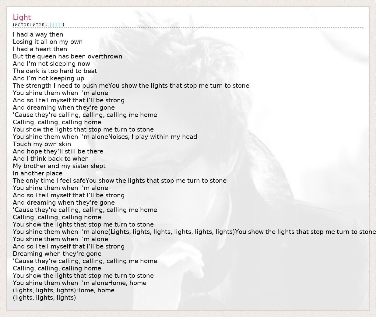 I had a way then Losing it all on my own I had a heart then But the queen has been overthrown And I'm not sleeping now The dark is too hard to beat And I'm not keeping up The strength I need to push meYou show the lights that stop me turn to stone You shine them when I'm alone And so I tell myself that I'll be strong And dreaming when they're gone 'Cause they're calling, calling, calling me home Calling, calling, calling home You show the lights that stop me turn to stone You shine them when I'm aloneNoises, I play within my head Touch my own skin And hope they'll still be there And I think back to when My brother and my sister slept In another place The only time I feel safeYou show the lights that stop me turn to stone You shine them when I'm alone And so I tell myself that I'll be strong And dreaming when they're gone 'Cause they're calling, calling, calling me home Calling, calling, calling home You show the lights that stop me turn to stone You shine them when I'm alone(Lights, lights, lights, lights, lights, lights)You show the lights that stop me turn to stone You shine them when I'm alone And so I tell myself that I'll be strong Dreaming when they're gone 'Cause they're calling, calling, calling me home Calling, calling, calling home You show the lights that stop me turn to stone You shine them when I'm aloneHome, home (lights, lights, lights)Home, home (lights, lights, lights)