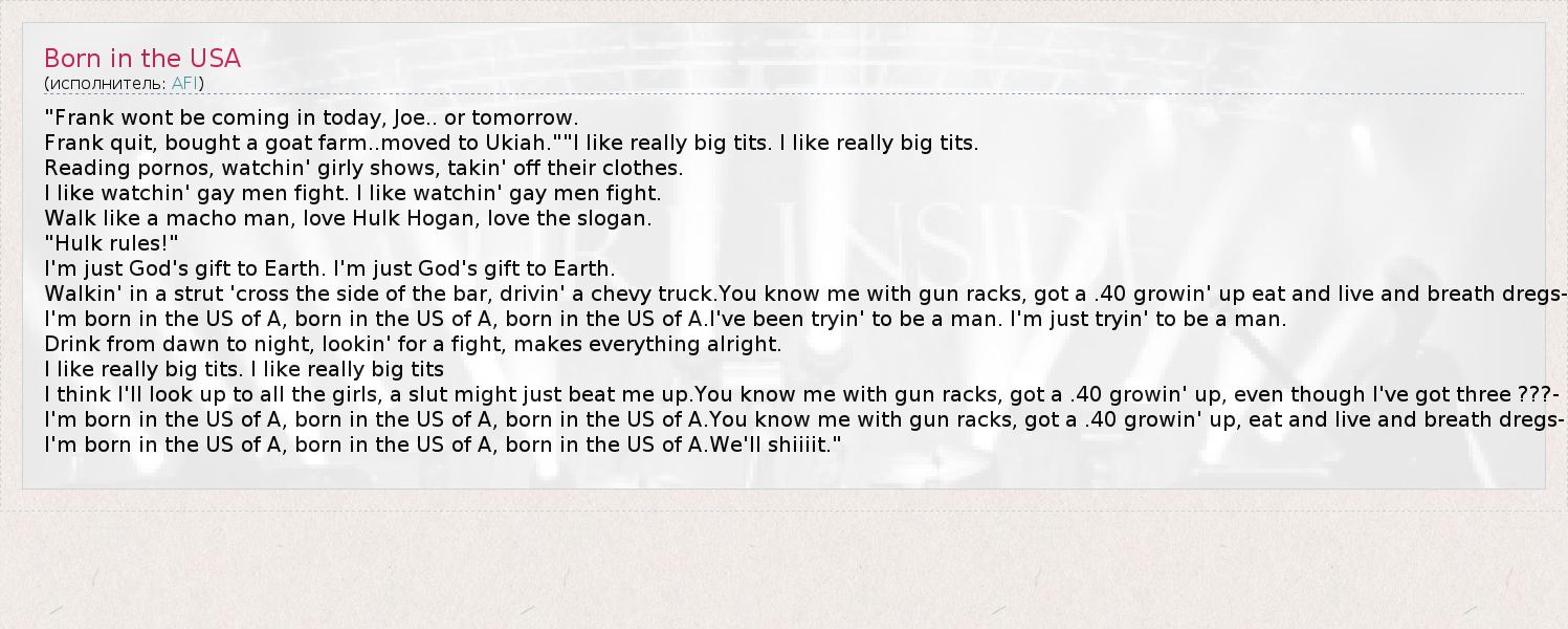 I'm born in the US of A, born in the US of A, born in the US of A.You know me with gun racks, got a .40 growin' up, eat and live and breath dregs-