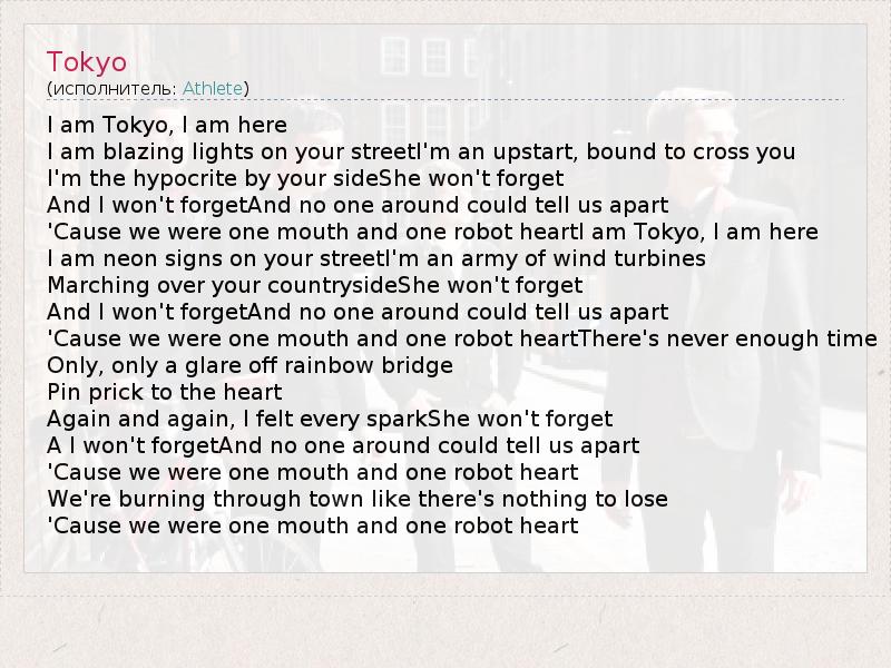 А как ты думаешь, о чем песня "Tokyo" ?