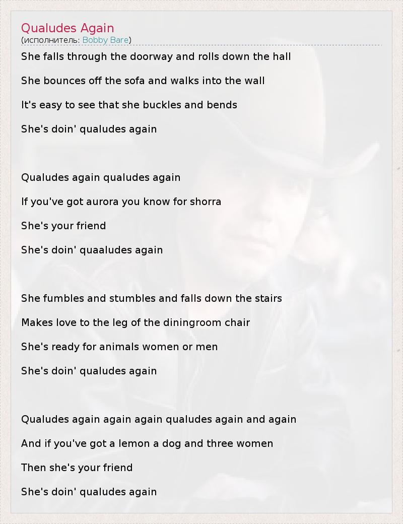 She falls through the doorway and rolls down the hall She bounces off the sofa and walks into the wall It's easy to see that she buckles and bends She's doin' qualudes again Qualudes again qualudes again If you've got aurora you know for shorra She's your friend She's doin' quaaludes again She fumbles and stumbles and falls down the stairs Makes love to the leg of the diningroom chair She's ready for animals women or men She's doin' qualudes again Qualudes again again again qualudes again and again And if you've got a lemon a dog and three women Then she's your friend She's doin' qualudes again