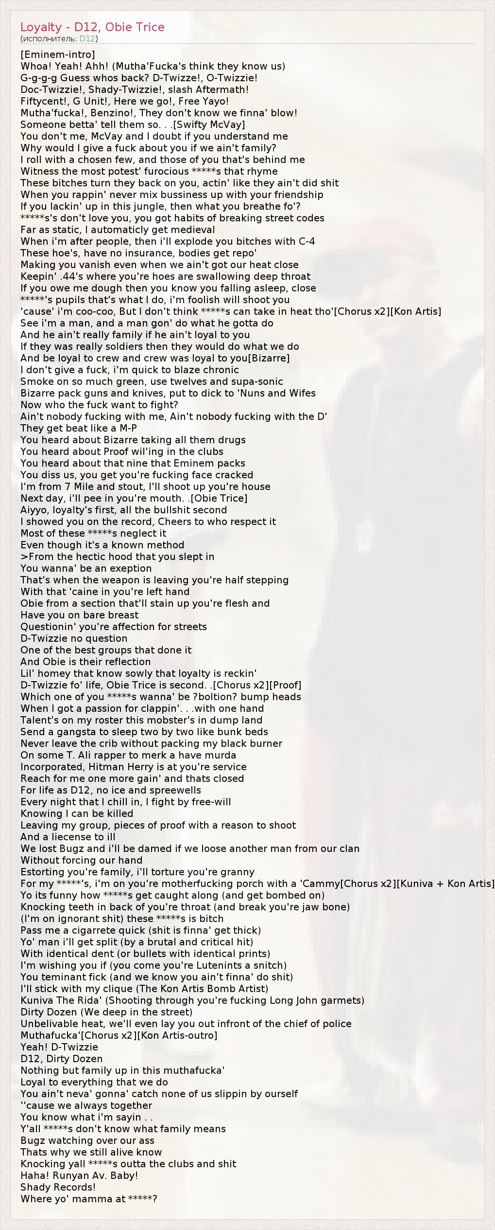 А как ты думаешь, о чем песня "Loyalty - D12, Obie Trice" ?