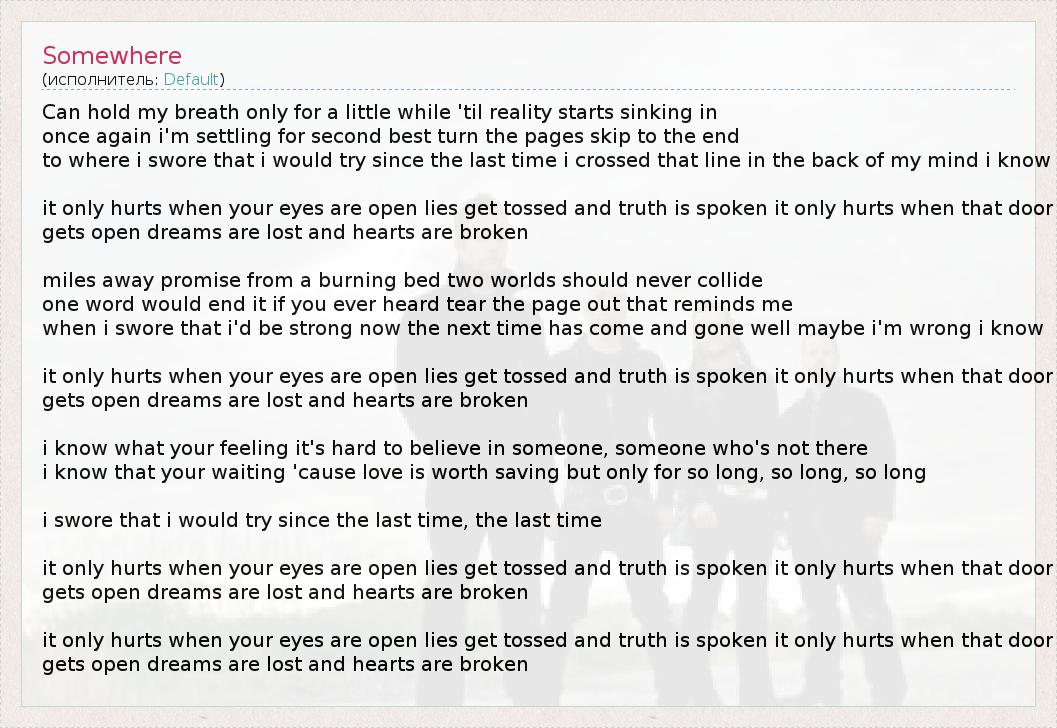 Это интересно:Default — канадская рок-группа, образовавшаяся в 1999 году в Ванкувер, Канада, стараниями гитариста Джереми Хора и ударника Дэнни Крэйга, имевшими уже четырехлетний опыт на местной Ванкуверской сцене. Сначала у группы было название Fallout. После прослушивания нескольких вокалистов их выбор пал на бывшего одноклассника Далласа Смита, чья энергия и рвение компенсировали его неопытность. Ребята... продолжение