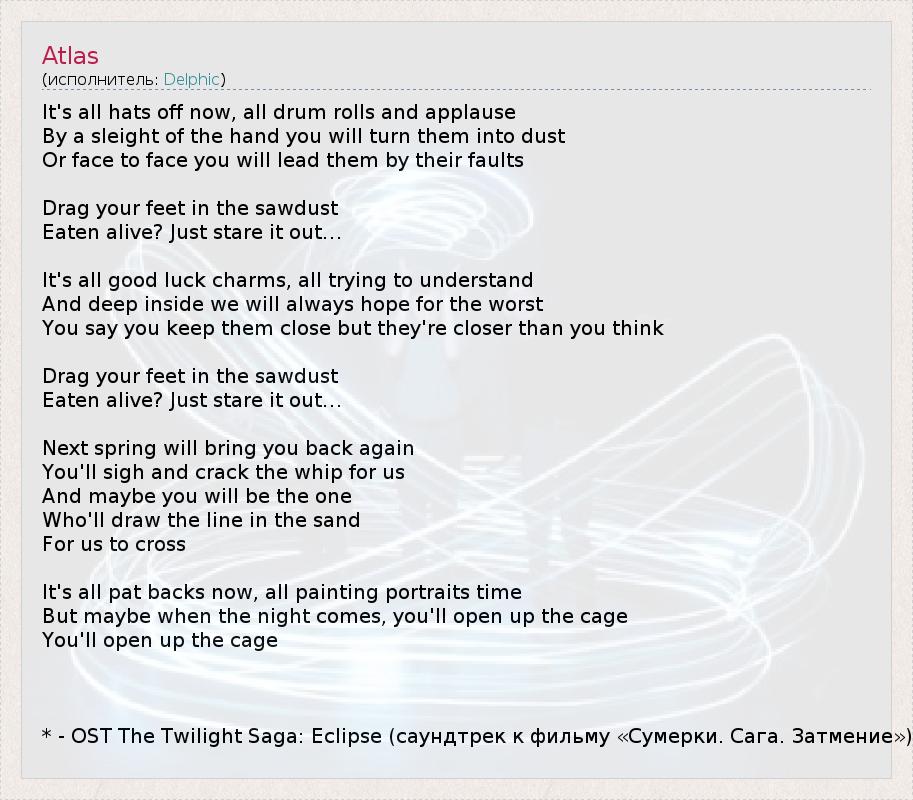 It's all hats off now, all drum rolls and applause By a sleight of the hand you will turn them into dust Or face to face you will lead them by their faults Drag your feet in the sawdust Eaten alive? Just stare it out… It's all good luck charms, all trying to understand And deep inside we will always hope for the worst You say you keep them close but they're closer than you think Drag your feet in the sawdust Eaten alive? Just stare it out… Next spring will bring you back again You'll sigh and crack the whip for us And maybe you will be the one Who'll draw the line in the sand For us to cross It's all pat backs now, all painting portraits time But maybe when the night comes, you'll open up the cage You'll open up the cage * - OST The Twilight Saga: Eclipse (саундтрек к фильму «Сумерки. Сага. Затмение»)