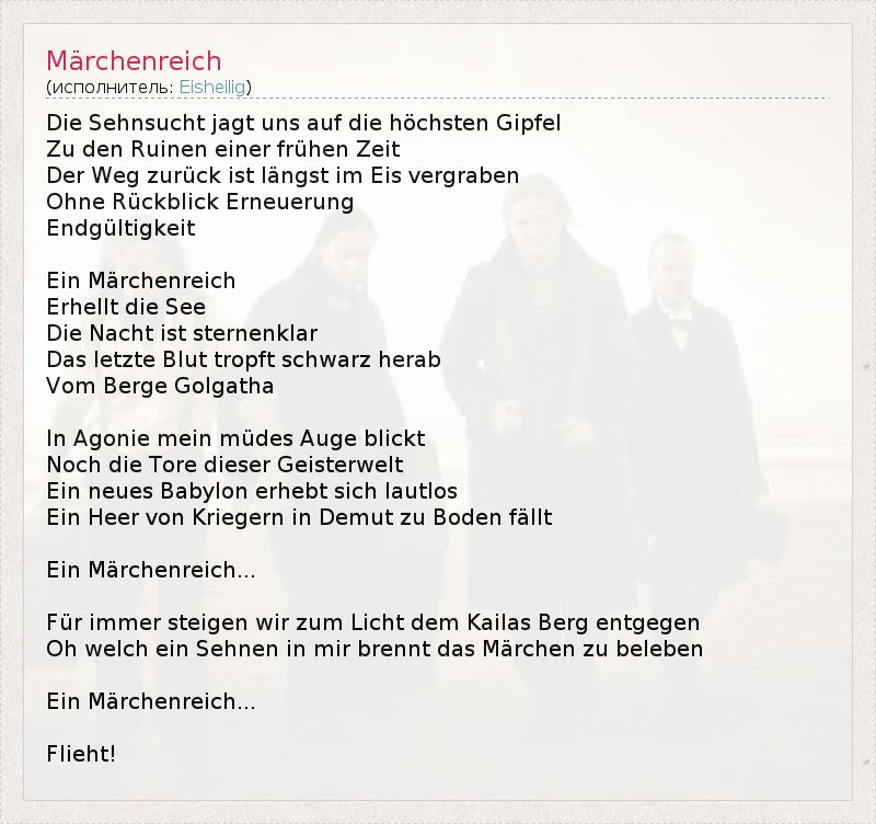 Die Sehnsucht jagt uns auf die höchsten Gipfel Zu den Ruinen einer frühen Zeit Der Weg zurück ist längst im Eis vergraben Ohne Rückblick Erneuerung Endgültigkeit Ein Märchenreich Erhellt die See Die Nacht ist sternenklar Das letzte Blut tropft schwarz herab Vom Berge Golgatha In Agonie mein müdes Auge blickt Noch die Tore dieser Geisterwelt Ein neues Babylon erhebt sich lautlos Ein Heer von Kriegern in Demut zu Boden fällt Ein Märchenreich... Für immer steigen wir zum Licht dem Kailas Berg entgegen Oh welch ein Sehnen in mir brennt das Märchen zu beleben Ein Märchenreich... Flieht!