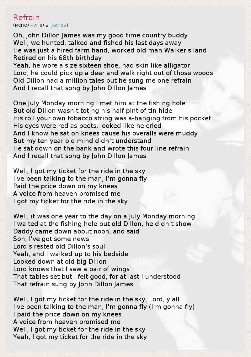 Oh, John Dillon James was my good time country buddy Well, we hunted, talked and fished his last days away He was just a hired farm hand, worked old man Walker's land Retired on his 68th birthday Yeah, he wore a size sixteen shoe, had skin like alligator Lord, he could pick up a deer and walk right out of those woods Old Dillon had a million tales but he sung me one refrain And I recall that song by John Dillon James One July Monday morning I met him at the fishing hole But old Dillon wasn't toting his half pint of tin hide His roll your own tobacco string was a-hanging from his pocket His eyes were red as beets, looked like he cried And I know he sat on knees cause his overalls were muddy But my ten year old mind didn't understand He sat down on the bank and wrote this four line refrain And I recall that song by John Dillon James Well, I got my ticket for the ride in the sky I've been talking to the man, I'm gonna fly Paid the price down on my knees A voice from heaven promised me I got my ticket for the ride in the sky Well, it was one year to the day on a July Monday morning I waited at the fishing hole but old Dillon, he didn't show Daddy came down about noon, and said Son, I've got some news Lord's rested old Dillon's soul Yeah, and I walked up to his bedside Looked down at old big Dillon Lord knows that I saw a pair of wings That tables set but I felt good, for at last I understood That refrain sung by John Dillon James Well, I got my ticket for the ride in the sky, Lord, y'all I've been talking to the man, I'm gonna fly (I'm gonna fly) I paid the price down on my knees A voice from heaven promised me Well, I got my ticket for the ride in the sky Yeah, I got my ticket for the ride in the sky