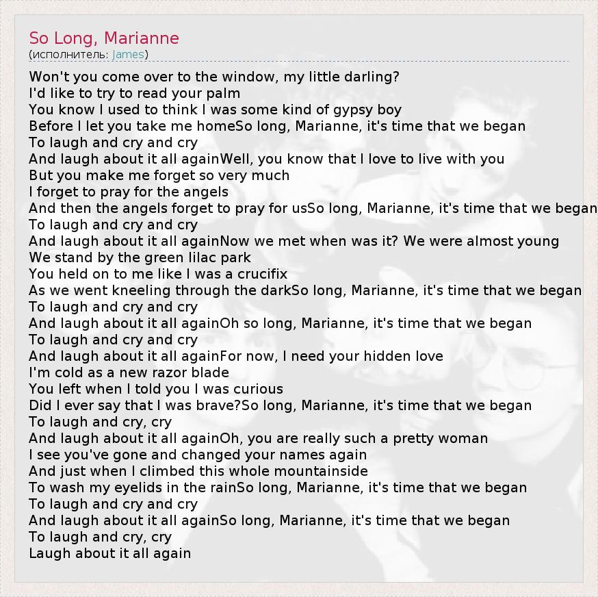 Won't you come over to the window, my little darling? I'd like to try to read your palm You know I used to think I was some kind of gypsy boy Before I let you take me homeSo long, Marianne, it's time that we began To laugh and cry and cry And laugh about it all againWell, you know that I love to live with you But you make me forget so very much I forget to pray for the angels And then the angels forget to pray for usSo long, Marianne, it's time that we began To laugh and cry and cry And laugh about it all againNow we met when was it? We were almost young We stand by the green lilac park You held on to me like I was a crucifix As we went kneeling through the darkSo long, Marianne, it's time that we began To laugh and cry and cry And laugh about it all againOh so long, Marianne, it's time that we began To laugh and cry and cry And laugh about it all againFor now, I need your hidden love I'm cold as a new razor blade You left when I told you I was curious Did I ever say that I was brave?So long, Marianne, it's time that we began To laugh and cry, cry And laugh about it all againOh, you are really such a pretty woman I see you've gone and changed your names again And just when I climbed this whole mountainside To wash my eyelids in the rainSo long, Marianne, it's time that we began To laugh and cry and cry And laugh about it all againSo long, Marianne, it's time that we began To laugh and cry, cry Laugh about it all again