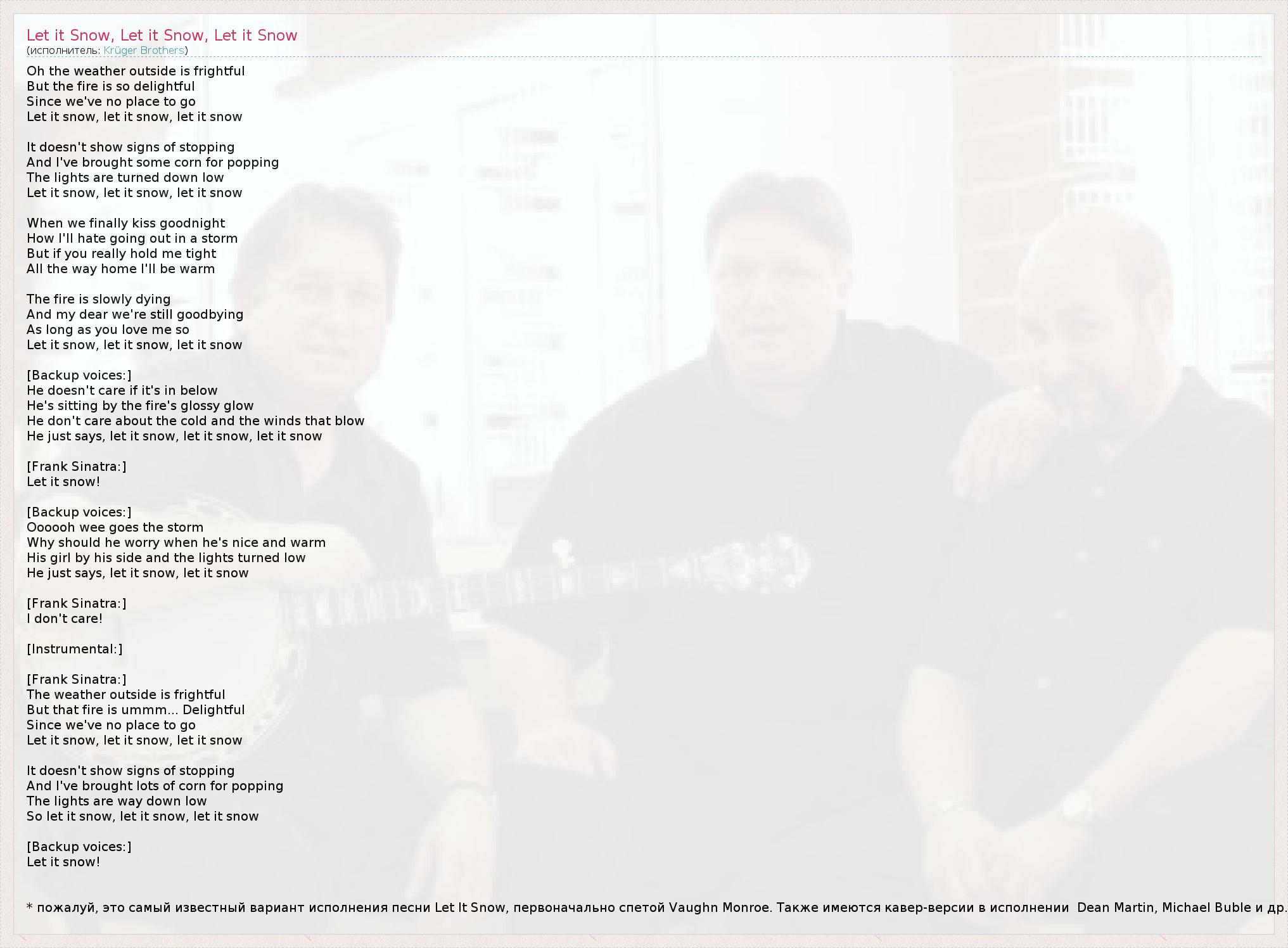 * пожалуй, это самый известный вариант исполнения песни Let It Snow, первоначально спетой Vaughn Monroe. Также имеются кавер-версии в исполнении  Dean Martin, Michael Buble и др.