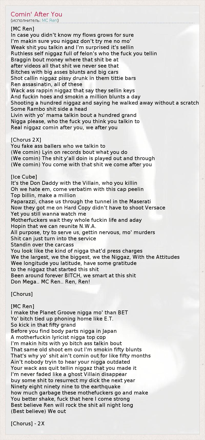 Это интересно:Уроженец Комптона Лоренцо Паттерсон (Lorenzo Patterson), он же MC Ren, он же Villain In Black, он же Bitch Made Nigga Killa, он же Shock Of The Hour и Mad Scientist, хорошо помнит, как 17–летним подростком прямо из школы его взяли, как потом оказалось, в одну из самых революционных рэп–групп всех времен и народов. А стоял за всем этим делом, как вы, наверное, догадываетесь, Eazy–E. Позже во вкладыше альбома "Eternal E" Рен напишет следующие... продолжение