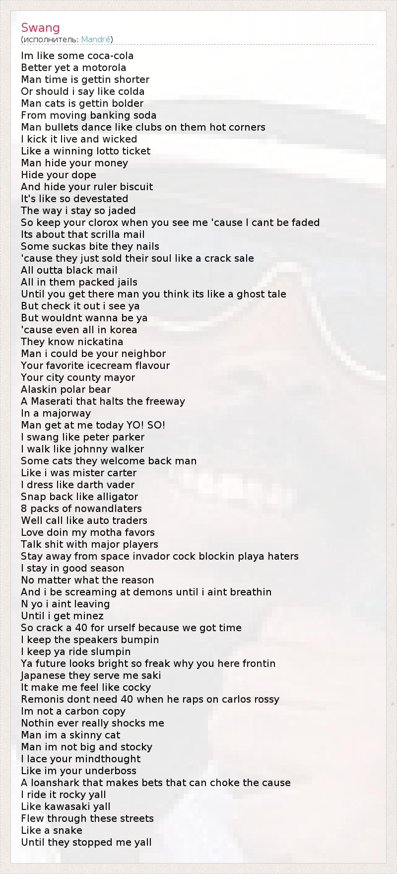 Im like some coca-cola Better yet a motorola Man time is gettin shorter Or should i say like colda Man cats is gettin bolder From moving banking soda Man bullets dance like clubs on them hot corners I kick it live and wicked Like a winning lotto ticket Man hide your money Hide your dope And hide your ruler biscuit It's like so devestated The way i stay so jaded So keep your clorox when you see me 'cause I cant be faded Its about that scrilla mail Some suckas bite they nails 'cause they just sold their soul like a crack sale All outta black mail All in them packed jails Until you get there man you think its like a ghost tale But check it out i see ya But wouldnt wanna be ya 'cause even all in korea They know nickatina Man i could be your neighbor Your favorite icecream flavour Your city county mayor Alaskin polar bear A Maserati that halts the freeway In a majorway Man get at me today YO! SO! I swang like peter parker I walk like johnny walker Some cats they welcome back man Like i was mister carter I dress like darth vader Snap back like alligator 8 packs of nowandlaters Well call like auto traders Love doin my motha favors Talk shit with major players Stay away from space invador cock blockin playa haters I stay in good season No matter what the reason And i be screaming at demons until i aint breathin N yo i aint leaving Until i get minez So crack a 40 for urself because we got time I keep the speakers bumpin I keep ya ride slumpin Ya future looks bright so freak why you here frontin Japanese they serve me saki It make me feel like cocky Remonis dont need 40 when he raps on carlos rossy Im not a carbon copy Nothin ever really shocks me Man im a skinny cat Man im not big and stocky I lace your mindthought Like im your underboss A loanshark that makes bets that can choke the cause I ride it rocky yall Like kawasaki yall Flew through these streets Like a snake Until they stopped me yall