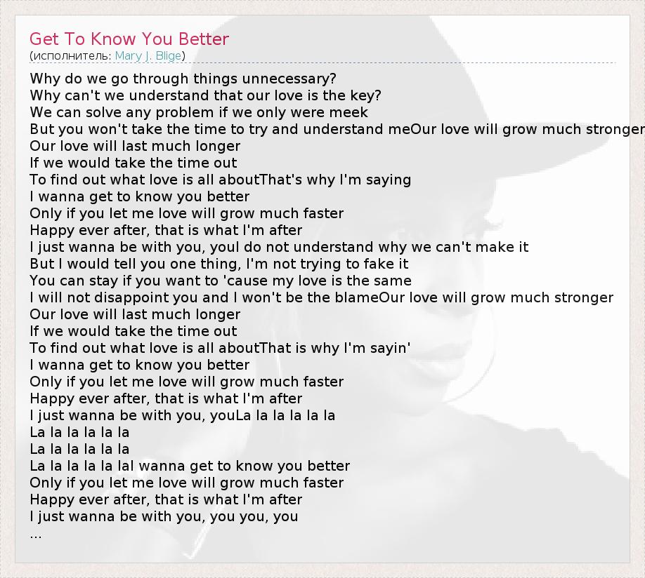 Why do we go through things unnecessary? Why can't we understand that our love is the key? We can solve any problem if we only were meek But you won't take the time to try and understand meOur love will grow much stronger Our love will last much longer If we would take the time out To find out what love is all aboutThat's why I'm saying I wanna get to know you better Only if you let me love will grow much faster Happy ever after, that is what I'm after I just wanna be with you, youI do not understand why we can't make it But I would tell you one thing, I'm not trying to fake it You can stay if you want to 'cause my love is the same I will not disappoint you and I won't be the blameOur love will grow much stronger Our love will last much longer If we would take the time out To find out what love is all aboutThat is why I'm sayin' I wanna get to know you better Only if you let me love will grow much faster Happy ever after, that is what I'm after I just wanna be with you, youLa la la la la la La la la la la la La la la la la la La la la la la laI wanna get to know you better Only if you let me love will grow much faster Happy ever after, that is what I'm after I just wanna be with you, you you, you ...