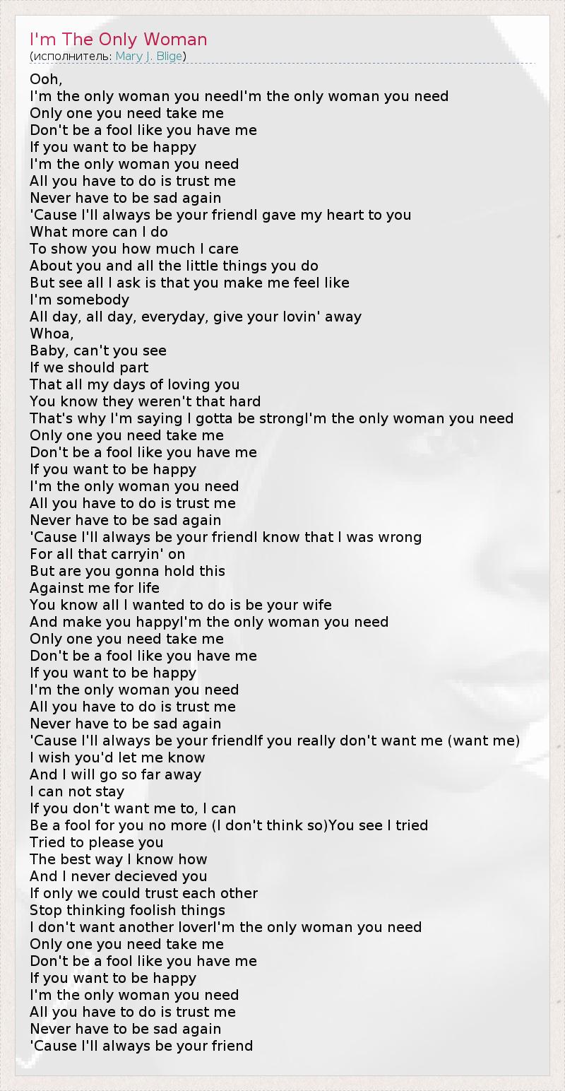 Ooh, I'm the only woman you needI'm the only woman you need Only one you need take me Don't be a fool like you have me If you want to be happy I'm the only woman you need All you have to do is trust me Never have to be sad again 'Cause I'll always be your friendI gave my heart to you What more can I do To show you how much I care About you and all the little things you do But see all I ask is that you make me feel like I'm somebody All day, all day, everyday, give your lovin' away Whoa, Baby, can't you see If we should part That all my days of loving you You know they weren't that hard That's why I'm saying I gotta be strongI'm the only woman you need Only one you need take me Don't be a fool like you have me If you want to be happy I'm the only woman you need All you have to do is trust me Never have to be sad again 'Cause I'll always be your friendI know that I was wrong For all that carryin' on But are you gonna hold this Against me for life You know all I wanted to do is be your wife And make you happyI'm the only woman you need Only one you need take me Don't be a fool like you have me If you want to be happy I'm the only woman you need All you have to do is trust me Never have to be sad again 'Cause I'll always be your friendIf you really don't want me (want me) I wish you'd let me know And I will go so far away I can not stay If you don't want me to, I can Be a fool for you no more (I don't think so)You see I tried Tried to please you The best way I know how And I never decieved you If only we could trust each other Stop thinking foolish things I don't want another loverI'm the only woman you need Only one you need take me Don't be a fool like you have me If you want to be happy I'm the only woman you need All you have to do is trust me Never have to be sad again 'Cause I'll always be your friend
