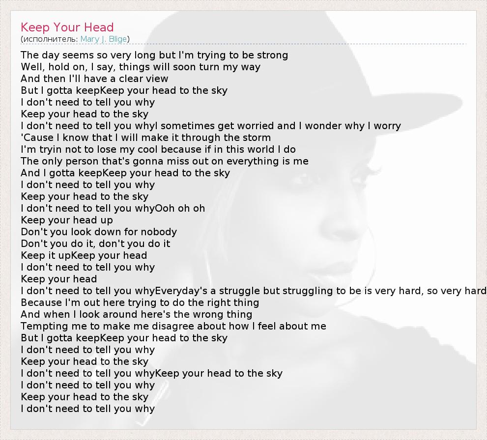 The day seems so very long but I'm trying to be strong Well, hold on, I say, things will soon turn my way And then I'll have a clear view But I gotta keepKeep your head to the sky I don't need to tell you why Keep your head to the sky I don't need to tell you whyI sometimes get worried and I wonder why I worry 'Cause I know that I will make it through the storm I'm tryin not to lose my cool because if in this world I do The only person that's gonna miss out on everything is me And I gotta keepKeep your head to the sky I don't need to tell you why Keep your head to the sky I don't need to tell you whyOoh oh oh Keep your head up Don't you look down for nobody Don't you do it, don't you do it Keep it upKeep your head I don't need to tell you why Keep your head I don't need to tell you whyEveryday's a struggle but struggling to be is very hard, so very hard Because I'm out here trying to do the right thing And when I look around here's the wrong thing Tempting me to make me disagree about how I feel about me But I gotta keepKeep your head to the sky I don't need to tell you why Keep your head to the sky I don't need to tell you whyKeep your head to the sky I don't need to tell you why Keep your head to the sky I don't need to tell you why