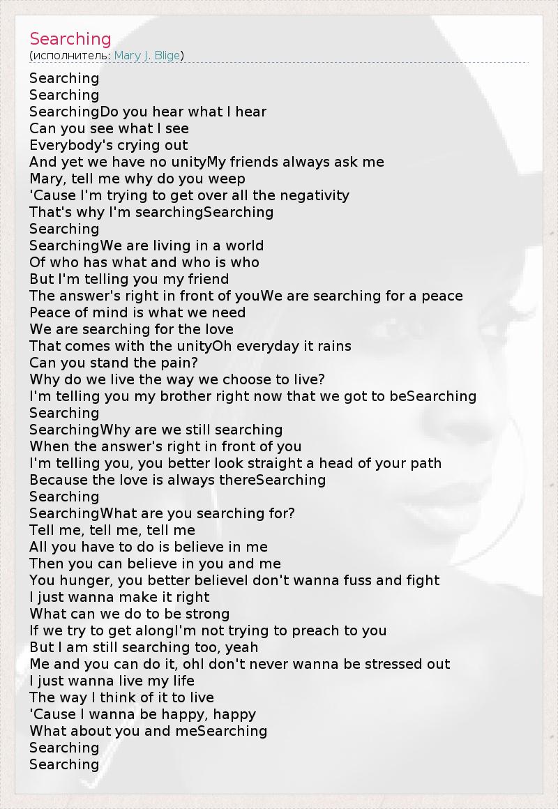 Searching Searching SearchingDo you hear what I hear Can you see what I see Everybody's crying out And yet we have no unityMy friends always ask me Mary, tell me why do you weep 'Cause I'm trying to get over all the negativity That's why I'm searchingSearching Searching SearchingWe are living in a world Of who has what and who is who But I'm telling you my friend The answer's right in front of youWe are searching for a peace Peace of mind is what we need We are searching for the love That comes with the unityOh everyday it rains Can you stand the pain? Why do we live the way we choose to live? I'm telling you my brother right now that we got to beSearching Searching SearchingWhy are we still searching When the answer's right in front of you I'm telling you, you better look straight a head of your path Because the love is always thereSearching Searching SearchingWhat are you searching for? Tell me, tell me, tell me All you have to do is believe in me Then you can believe in you and me You hunger, you better believeI don't wanna fuss and fight I just wanna make it right What can we do to be strong If we try to get alongI'm not trying to preach to you But I am still searching too, yeah Me and you can do it, ohI don't never wanna be stressed out I just wanna live my life The way I think of it to live 'Cause I wanna be happy, happy What about you and meSearching Searching Searching