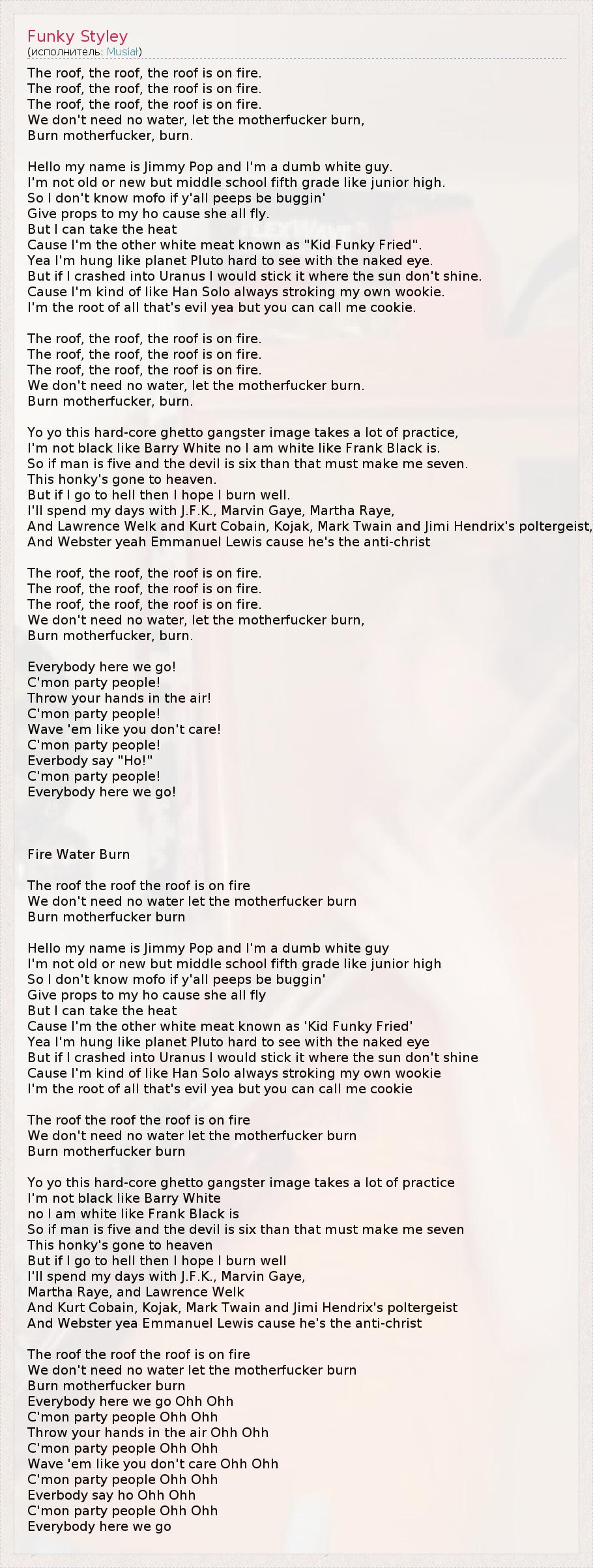 The roof, the roof, the roof is on fire. The roof, the roof, the roof is on fire. The roof, the roof, the roof is on fire. We don't need no water, let the motherfucker burn, Burn motherfucker, burn. Hello my name is Jimmy Pop and I'm a dumb white guy. I'm not old or new but middle school fifth grade like junior high. So I don't know mofo if y'all peeps be buggin' Give props to my ho cause she all fly. But I can take the heat Cause I'm the other white meat known as "Kid Funky Fried". Yea I'm hung like planet Pluto hard to see with the naked eye. But if I crashed into Uranus I would stick it where the sun don't shine. Cause I'm kind of like Han Solo always stroking my own wookie. I'm the root of all that's evil yea but you can call me cookie. The roof, the roof, the roof is on fire. The roof, the roof, the roof is on fire. The roof, the roof, the roof is on fire. We don't need no water, let the motherfucker burn. Burn motherfucker, burn. Yo yo this hard-core ghetto gangster image takes a lot of practice, I'm not black like Barry White no I am white like Frank Black is. So if man is five and the devil is six than that must make me seven. This honky's gone to heaven. But if I go to hell then I hope I burn well. I'll spend my days with J.F.K., Marvin Gaye, Martha Raye, And Lawrence Welk and Kurt Cobain, Kojak, Mark Twain and Jimi Hendrix's poltergeist, And Webster yeah Emmanuel Lewis cause he's the anti-christ The roof, the roof, the roof is on fire. The roof, the roof, the roof is on fire. The roof, the roof, the roof is on fire. We don't need no water, let the motherfucker burn, Burn motherfucker, burn. Everybody here we go! C'mon party people! Throw your hands in the air! C'mon party people! Wave 'em like you don't care! C'mon party people! Everbody say "Ho!" C'mon party people! Everybody here we go! Fire Water Burn The roof the roof the roof is on fire We don't need no water let the motherfucker burn Burn motherfucker burn Hello my name is Jimmy Pop and I'm a dumb white guy I'm not old or new but middle school fifth grade like junior high So I don't know mofo if y'all peeps be buggin' Give props to my ho cause she all fly But I can take the heat Cause I'm the other white meat known as 'Kid Funky Fried' Yea I'm hung like planet Pluto hard to see with the naked eye But if I crashed into Uranus I would stick it where the sun don't shine Cause I'm kind of like Han Solo always stroking my own wookie I'm the root of all that's evil yea but you can call me cookie The roof the roof the roof is on fire We don't need no water let the motherfucker burn Burn motherfucker burn Yo yo this hard-core ghetto gangster image takes a lot of practice I'm not black like Barry White no I am white like Frank Black is So if man is five and the devil is six than that must make me seven This honky's gone to heaven But if I go to hell then I hope I burn well I'll spend my days with J.F.K., Marvin Gaye, Martha Raye, and Lawrence Welk And Kurt Cobain, Kojak, Mark Twain and Jimi Hendrix's poltergeist And Webster yea Emmanuel Lewis cause he's the anti-christ The roof the roof the roof is on fire We don't need no water let the motherfucker burn Burn motherfucker burn Everybody here we go Ohh Ohh C'mon party people Ohh Ohh Throw your hands in the air Ohh Ohh C'mon party people Ohh Ohh Wave 'em like you don't care Ohh Ohh C'mon party people Ohh Ohh Everbody say ho Ohh Ohh C'mon party people Ohh Ohh Everybody here we go