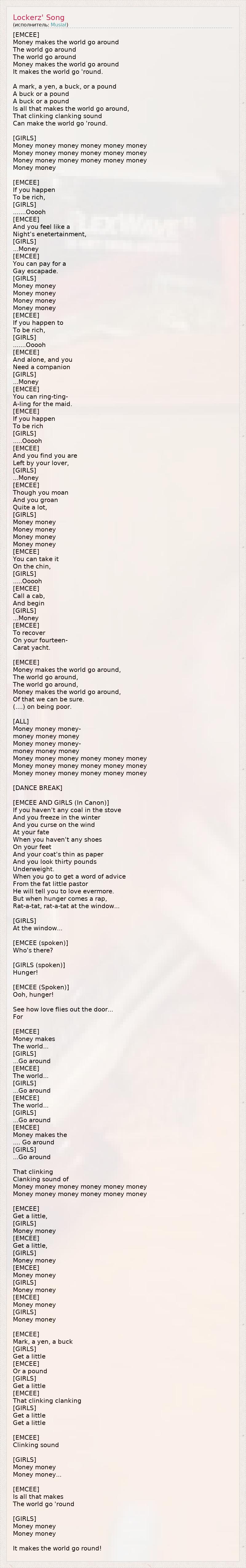 [EMCEE] Money makes the world go around The world go around The world go around Money makes the world go around It makes the world go 'round. A mark, a yen, a buck, or a pound A buck or a pound A buck or a pound Is all that makes the world go around, That clinking clanking sound Can make the world go 'round. [GIRLS] Money money money money money money Money money money money money money Money money money money money money Money money [EMCEE] If you happen To be rich, [GIRLS] .......Ooooh [EMCEE] And you feel like a Night's enetertainment, [GIRLS] ...Money [EMCEE] You can pay for a Gay escapade. [GIRLS] Money money Money money Money money Money money [EMCEE] If you happen to To be rich, [GIRLS] .......Ooooh [EMCEE] And alone, and you Need a companion [GIRLS] ...Money [EMCEE] You can ring-ting- A-ling for the maid. [EMCEE] If you happen To be rich [GIRLS] .....Ooooh [EMCEE] And you find you are Left by your lover, [GIRLS] ...Money [EMCEE] Though you moan And you groan Quite a lot, [GIRLS] Money money Money money Money money Money money [EMCEE] You can take it On the chin, [GIRLS] .....Ooooh [EMCEE] Call a cab, And begin [GIRLS] ...Money [EMCEE] To recover On your fourteen- Carat yacht. [EMCEE] Money makes the world go around, The world go around, The world go around, Money makes the world go around, Of that we can be sure. (....) on being poor. [ALL] Money money money- money money money Money money money- money money money Money money money money money money Money money money money money money Money money money money money money [DANCE BREAK] [EMCEE AND GIRLS (In Canon)] If you haven't any coal in the stove And you freeze in the winter And you curse on the wind At your fate When you haven't any shoes On your feet And your coat's thin as paper And you look thirty pounds Underweight. When you go to get a word of advice From the fat little pastor He will tell you to love evermore. But when hunger comes a rap, Rat-a-tat, rat-a-tat at the window... [GIRLS] At the window... [EMCEE (spoken)] Who's there? [GIRLS (spoken)] Hunger! [EMCEE (Spoken)] Ooh, hunger! See how love flies out the door... For [EMCEE] Money makes The world... [GIRLS] ...Go around [EMCEE] The world... [GIRLS] ...Go around [EMCEE] The world... [GIRLS] ...Go around [EMCEE] Money makes the .... Go around [GIRLS] ...Go around That clinking Clanking sound of Money money money money money money Money money money money money money [EMCEE] Get a little, [GIRLS] Money money [EMCEE] Get a little, [GIRLS] Money money [EMCEE] Money money [GIRLS] Money money [EMCEE] Money money [GIRLS] Money money [EMCEE] Mark, a yen, a buck [GIRLS] Get a little [EMCEE] Or a pound [GIRLS] Get a little [EMCEE] That clinking clanking [GIRLS] Get a little Get a little [EMCEE] Clinking sound [GIRLS] Money money Money money... [EMCEE] Is all that makes The world go 'round [GIRLS] Money money Money money It makes the world go round!