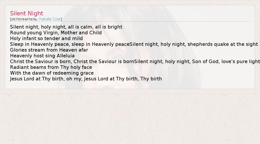 Это интересно:Несмотря на то, что Натали Коул является дочерью знаменитого певца Nat ''King'' Cole, она начала заниматься пением, только после поступления в Университет Штата Массачусетс.Натали начинала свою музыкальную карьеру, с того что писала песни, помимо этого таланта, она была великолепной пианисткой, пела вместе с Chuck Jackson и Marvin Yancy. Их музыка была смесью из различных музыкальных... продолжение