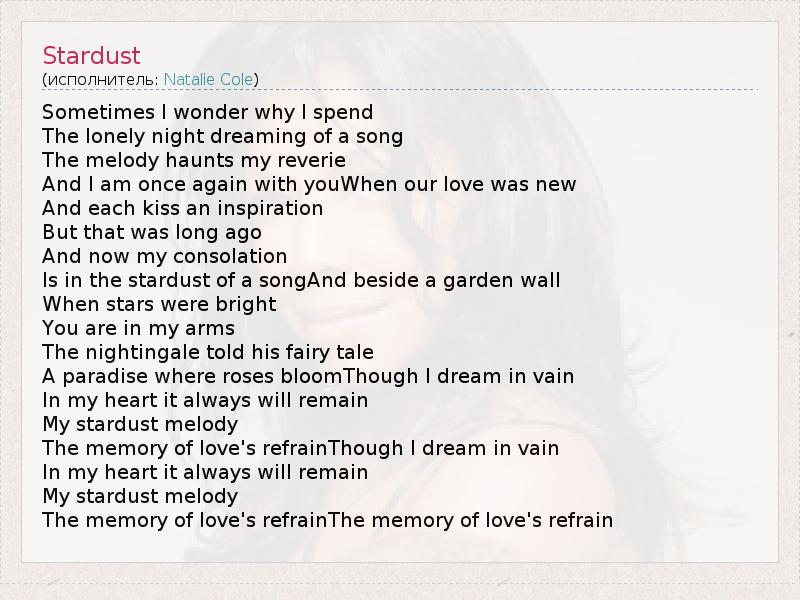 Это интересно:Несмотря на то, что Натали Коул является дочерью знаменитого певца Nat ''King'' Cole, она начала заниматься пением, только после поступления в Университет Штата Массачусетс.Натали начинала свою музыкальную карьеру, с того что писала песни, помимо этого таланта, она была великолепной пианисткой, пела вместе с Chuck Jackson и Marvin Yancy. Их музыка была смесью из различных музыкальных... продолжение