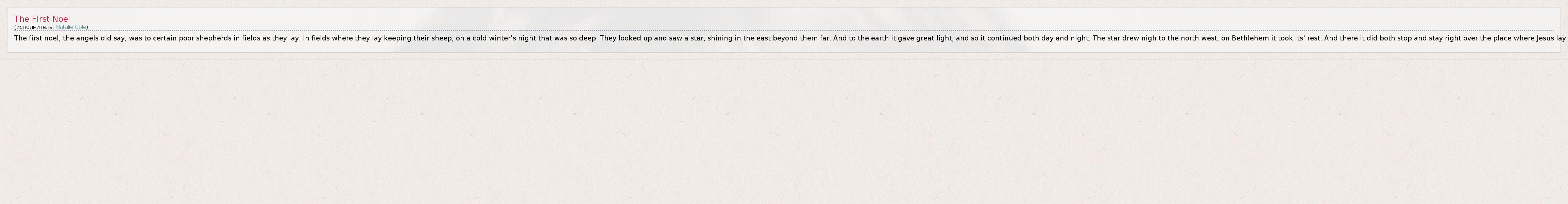 The first noel, the angels did say, was to certain poor shepherds in fields as they lay. In fields where they lay keeping their sheep, on a cold winter's night that was so deep. They looked up and saw a star, shining in the east beyond them far. And to the earth it gave great light, and so it continued both day and night. The star drew nigh to the north west, on Bethlehem it took its' rest. And there it did both stop and stay right over the place where Jesus lay.
