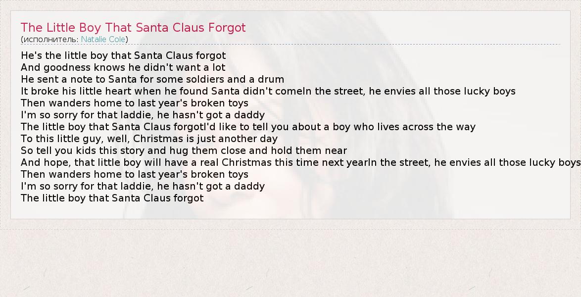 А как ты думаешь, о чем песня "The Little Boy That Santa Claus Forgot" ?