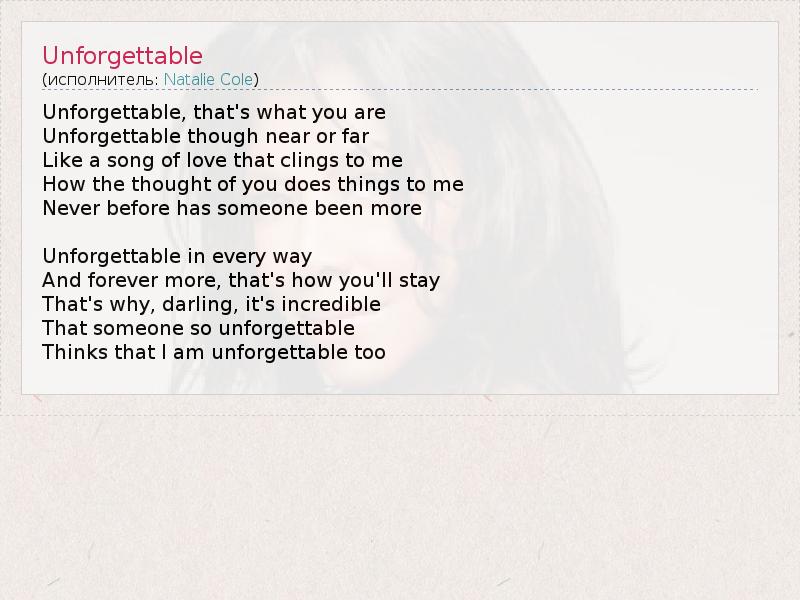 А как ты думаешь, о чем песня "Unforgettable" ?