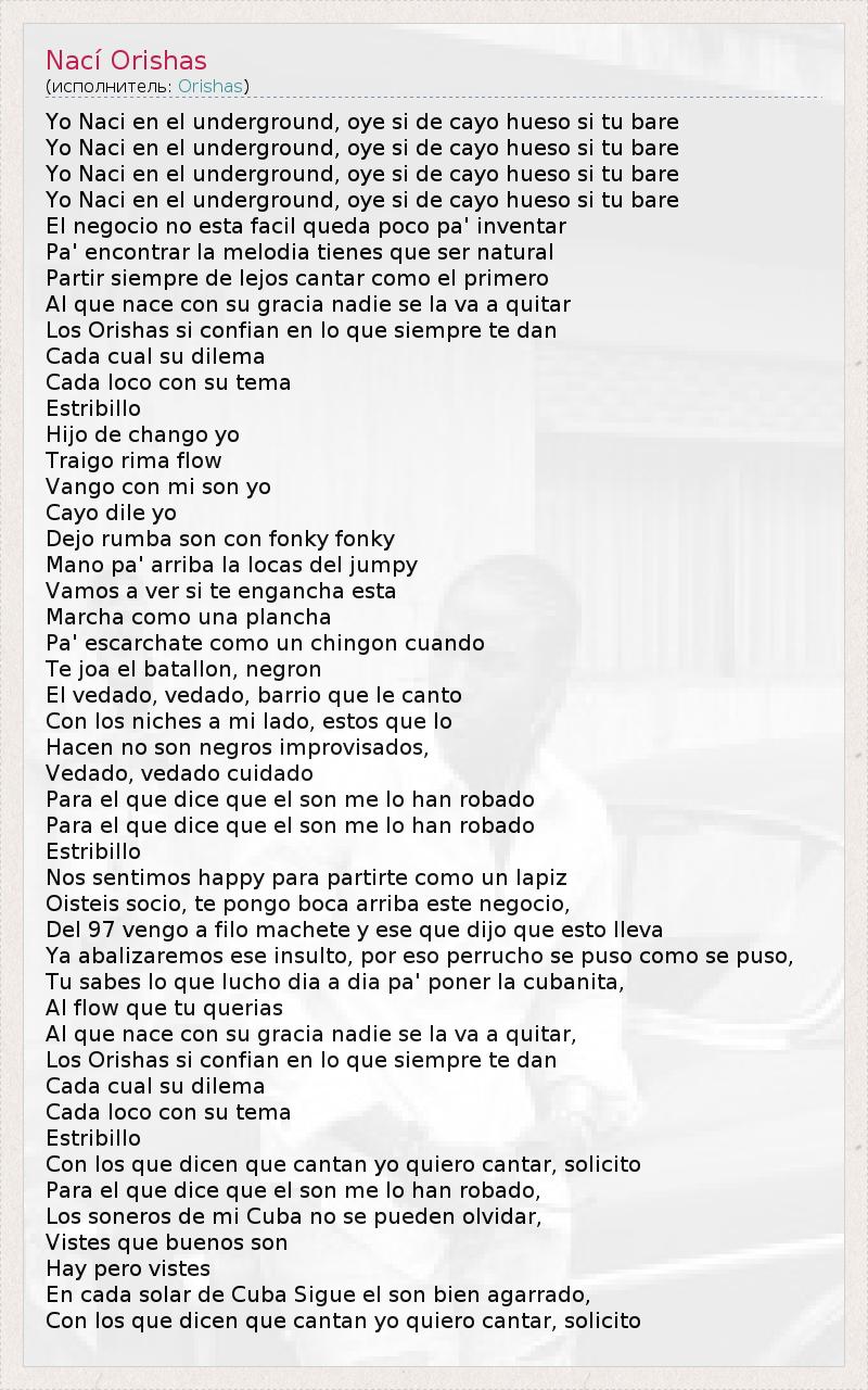 Yo Naci en el underground, oye si de cayo hueso si tu bare Yo Naci en el underground, oye si de cayo hueso si tu bare Yo Naci en el underground, oye si de cayo hueso si tu bare Yo Naci en el underground, oye si de cayo hueso si tu bare El negocio no esta facil queda poco pa' inventar Pa' encontrar la melodia tienes que ser natural Partir siempre de lejos cantar como el primero Al que nace con su gracia nadie se la va a quitar Los Orishas si confian en lo que siempre te dan Cada cual su dilema Cada loco con su tema Estribillo Hijo de chango yo Traigo rima flow Vango con mi son yo Cayo dile yo Dejo rumba son con fonky fonky Mano pa' arriba la locas del jumpy Vamos a ver si te engancha esta Marcha como una plancha Pa' escarchate como un chingon cuando Te joa el batallon, negron El vedado, vedado, barrio que le canto Con los niches a mi lado, estos que lo Hacen no son negros improvisados, Vedado, vedado cuidado Para el que dice que el son me lo han robado Para el que dice que el son me lo han robado Estribillo Nos sentimos happy para partirte como un lapiz Oisteis socio, te pongo boca arriba este negocio, Del 97 vengo a filo machete y ese que dijo que esto lleva Ya abalizaremos ese insulto, por eso perrucho se puso como se puso, Tu sabes lo que lucho dia a dia pa' poner la cubanita, Al flow que tu querias Al que nace con su gracia nadie se la va a quitar, Los Orishas si confian en lo que siempre te dan Cada cual su dilema Cada loco con su tema Estribillo Con los que dicen que cantan yo quiero cantar, solicito Para el que dice que el son me lo han robado, Los soneros de mi Cuba no se pueden olvidar, Vistes que buenos son Hay pero vistes En cada solar de Cuba Sigue el son bien agarrado, Con los que dicen que cantan yo quiero cantar, solicito