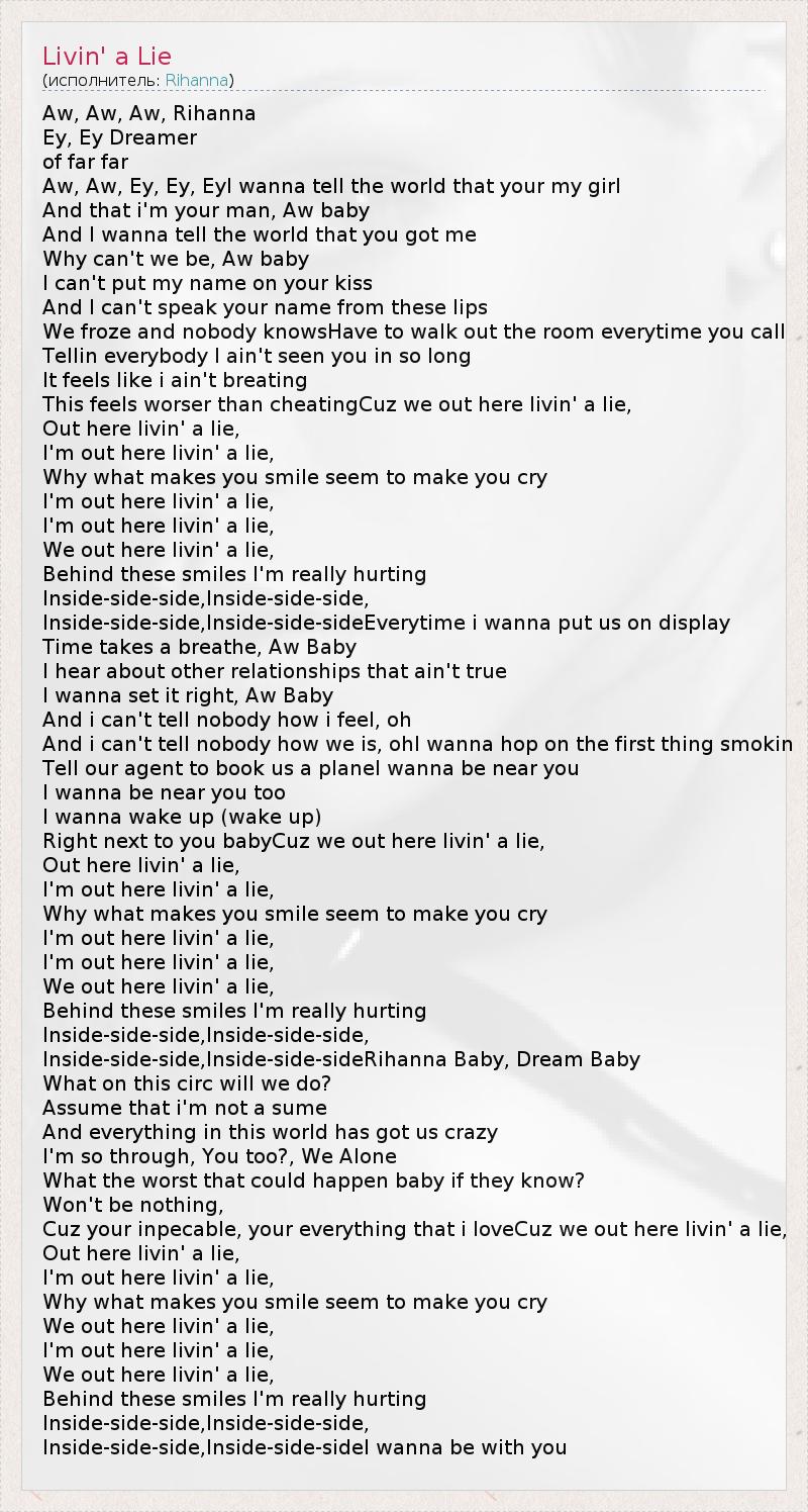 Aw, Aw, Aw, Rihanna Ey, Ey Dreamer of far far Aw, Aw, Ey, Ey, EyI wanna tell the world that your my girl And that i'm your man, Aw baby And I wanna tell the world that you got me Why can't we be, Aw baby I can't put my name on your kiss And I can't speak your name from these lips We froze and nobody knowsHave to walk out the room everytime you call Tellin everybody I ain't seen you in so long It feels like i ain't breating This feels worser than cheatingCuz we out here livin' a lie, Out here livin' a lie, I'm out here livin' a lie, Why what makes you smile seem to make you cry I'm out here livin' a lie, I'm out here livin' a lie, We out here livin' a lie, Behind these smiles I'm really hurting Inside-side-side,Inside-side-side, Inside-side-side,Inside-side-sideEverytime i wanna put us on display Time takes a breathe, Aw Baby I hear about other relationships that ain't true I wanna set it right, Aw Baby And i can't tell nobody how i feel, oh And i can't tell nobody how we is, ohI wanna hop on the first thing smokin Tell our agent to book us a planeI wanna be near you I wanna be near you too I wanna wake up (wake up) Right next to you babyCuz we out here livin' a lie, Out here livin' a lie, I'm out here livin' a lie, Why what makes you smile seem to make you cry I'm out here livin' a lie, I'm out here livin' a lie, We out here livin' a lie, Behind these smiles I'm really hurting Inside-side-side,Inside-side-side, Inside-side-side,Inside-side-sideRihanna Baby, Dream Baby What on this circ will we do? Assume that i'm not a sume And everything in this world has got us crazy I'm so through, You too?, We Alone What the worst that could happen baby if they know? Won't be nothing, Cuz your inpecable, your everything that i loveCuz we out here livin' a lie, Out here livin' a lie, I'm out here livin' a lie, Why what makes you smile seem to make you cry We out here livin' a lie, I'm out here livin' a lie, We out here livin' a lie, Behind these smiles I'm really hurting Inside-side-side,Inside-side-side, Inside-side-side,Inside-side-sideI wanna be with you