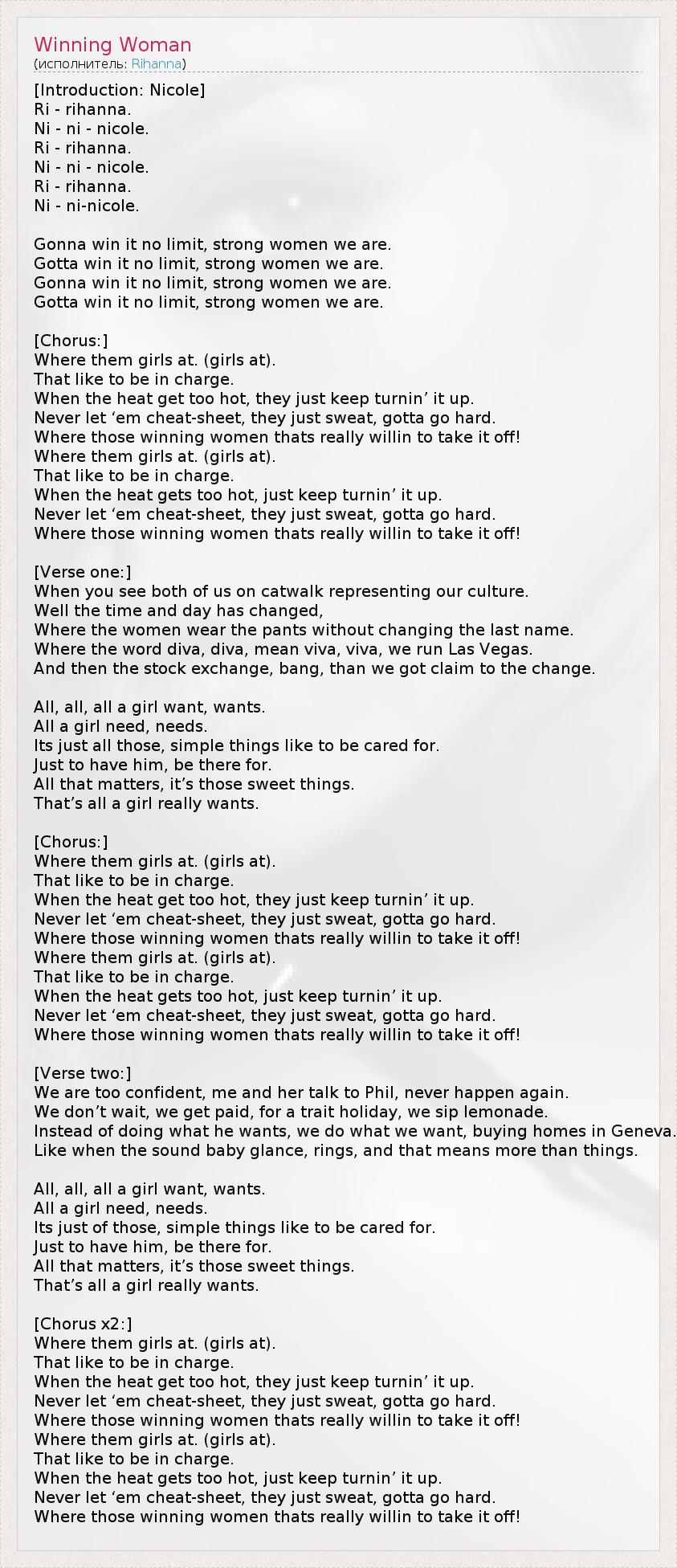 А как ты думаешь, о чем песня "Winning Woman" ?