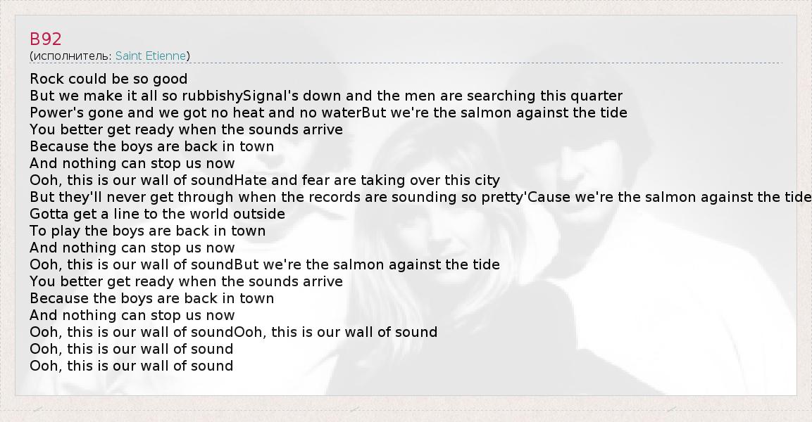 Это интересно:Трудно представить историю британской поп-музыки без «Saint Etienne». Их удивительная способность выпускать пластинки с настроением «шестидесятых» стала главной отличительной чертой группы. Вот уже десять лет «Saint Etienne» по праву занимают место самой стильной группы в Англии. «Музыка дизайнеров и арт-директоров» - такое определение «Saint Etienne» получили из уст одного журналиста. И действительно,... продолжение