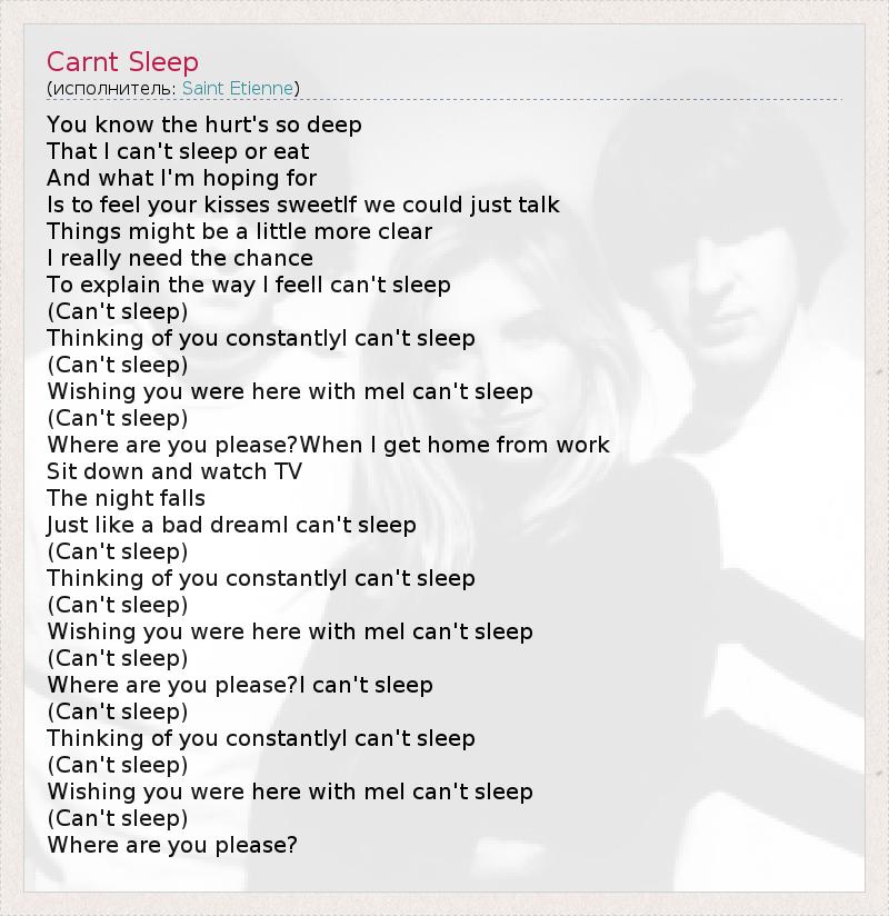You know the hurt's so deep That I can't sleep or eat And what I'm hoping for Is to feel your kisses sweetIf we could just talk Things might be a little more clear I really need the chance To explain the way I feelI can't sleep (Can't sleep) Thinking of you constantlyI can't sleep (Can't sleep) Wishing you were here with meI can't sleep (Can't sleep) Where are you please?When I get home from work Sit down and watch TV The night falls Just like a bad dreamI can't sleep (Can't sleep) Thinking of you constantlyI can't sleep (Can't sleep) Wishing you were here with meI can't sleep (Can't sleep) Where are you please?I can't sleep (Can't sleep) Thinking of you constantlyI can't sleep (Can't sleep) Wishing you were here with meI can't sleep (Can't sleep) Where are you please?
