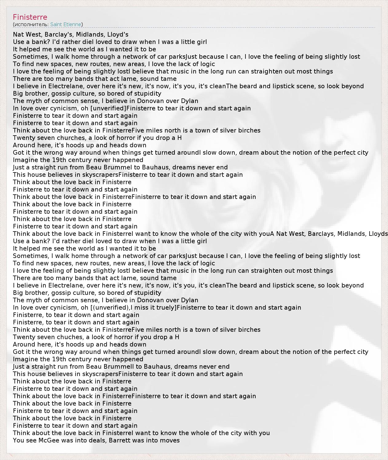 Think about the love back in FinisterreI want to know the whole of the city with youA Nat West, Barclays, Midlands, Lloyds