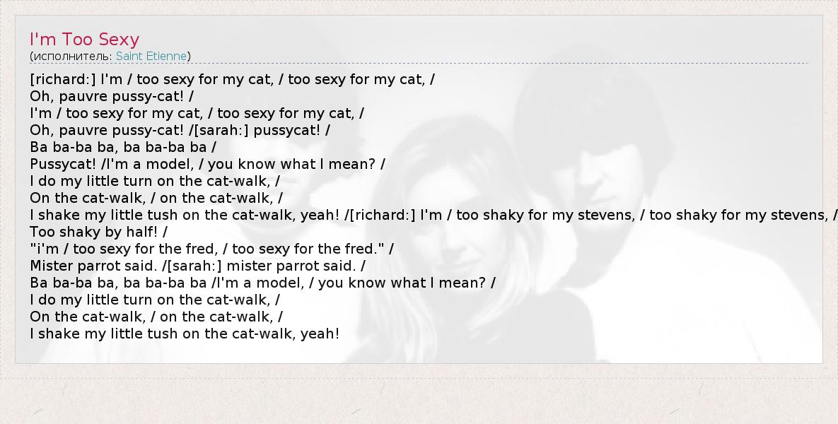 [richard:] I'm / too sexy for my cat, / too sexy for my cat, /