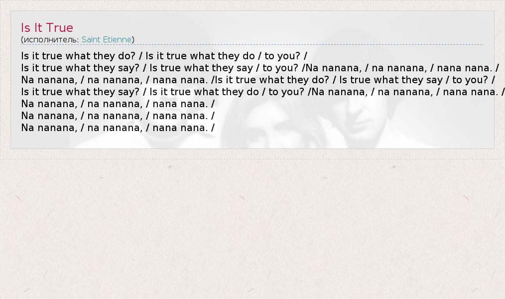 Is it true what they say? / Is true what they say / to you? /Na nanana, / na nanana, / nana nana. /
