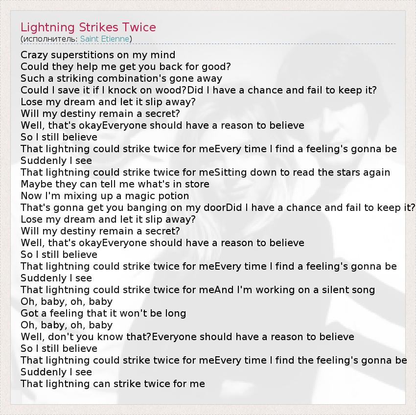 Crazy superstitions on my mind Could they help me get you back for good? Such a striking combination's gone away Could I save it if I knock on wood?Did I have a chance and fail to keep it? Lose my dream and let it slip away? Will my destiny remain a secret? Well, that's okayEveryone should have a reason to believe So I still believe That lightning could strike twice for meEvery time I find a feeling's gonna be Suddenly I see That lightning could strike twice for meSitting down to read the stars again Maybe they can tell me what's in store Now I'm mixing up a magic potion That's gonna get you banging on my doorDid I have a chance and fail to keep it? Lose my dream and let it slip away? Will my destiny remain a secret? Well, that's okayEveryone should have a reason to believe So I still believe That lightning could strike twice for meEvery time I find a feeling's gonna be Suddenly I see That lightning could strike twice for meAnd I'm working on a silent song Oh, baby, oh, baby Got a feeling that it won't be long Oh, baby, oh, baby Well, don't you know that?Everyone should have a reason to believe So I still believe That lightning could strike twice for meEvery time I find the feeling's gonna be Suddenly I see That lightning can strike twice for me
