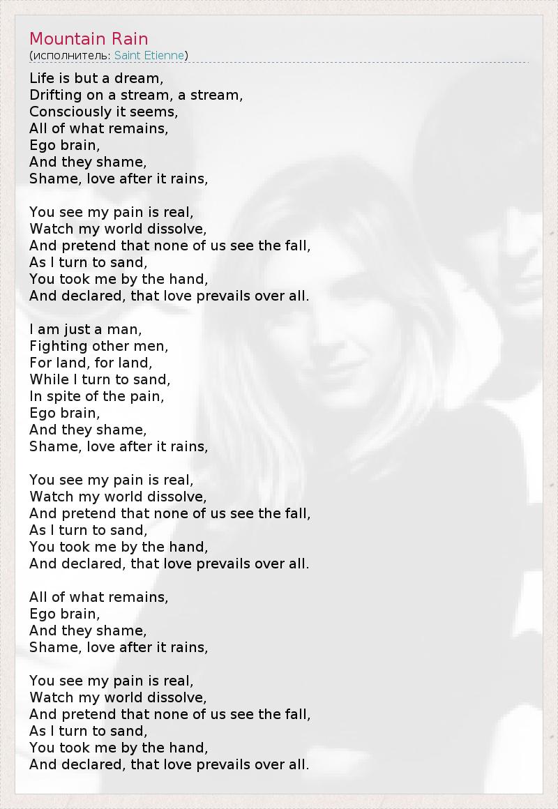 Жизнь - всего лишь мечта, Дрейфующая на поверхности потока, Кажется, что сознательно... Все, что остается, Это эгоистичный мозг, И они позорят, Позорят любовь после дождя... Ты видишь, что моя боль реальна, Смотри, мой мир распадается, И притворись, что ни один из нас не видит этого падения! Пока я превращаюсь в песок, Ты берёшь меня за руку И говоришь, что любовь превыше всего... Но я только человек, Борющийся со всеми остальными За место, за место под солнцем.... Пока я превращаюсь в песок, Несмотря на боль, Эгоистичный мозг, И они позорят, Позорят любовь после дождя... Ты видишь, что моя боль реальна, Смотри, мой мир распадается, И притворись, что ни один из нас не видит этого падения! Пока я превращаюсь в песок, Ты берёшь меня за руку И говоришь, что любовь превыше всего... Все, что остается, Это эгоистичный мозг, И они позорят, Позорят любовь после дождя... Ты видишь, что моя боль реальна, Смотри, мой мир распадается, И притворись, что ни один из нас не видит этого падения! Пока я превращаюсь в песок, Ты берёшь меня за руку И говоришь, что любовь превыше всего...