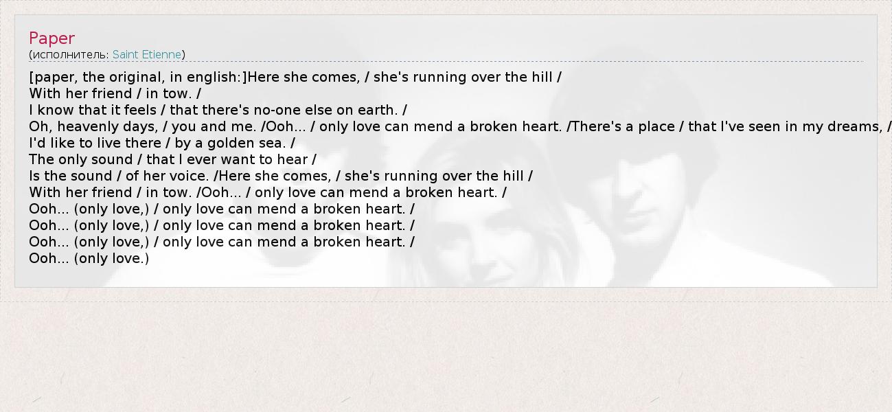 Это интересно:Трудно представить историю британской поп-музыки без «Saint Etienne». Их удивительная способность выпускать пластинки с настроением «шестидесятых» стала главной отличительной чертой группы. Вот уже десять лет «Saint Etienne» по праву занимают место самой стильной группы в Англии. «Музыка дизайнеров и арт-директоров» - такое определение «Saint Etienne» получили из уст одного журналиста. И действительно,... продолжение