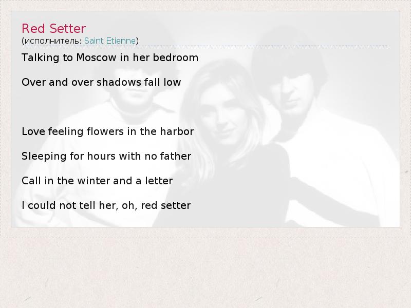 Talking to Moscow in her bedroom Over and over shadows fall low Love feeling flowers in the harbor Sleeping for hours with no father Call in the winter and a letter I could not tell her, oh, red setter