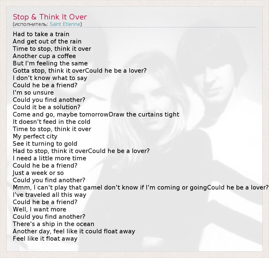А как ты думаешь, о чем песня "Stop & Think It Over" ?